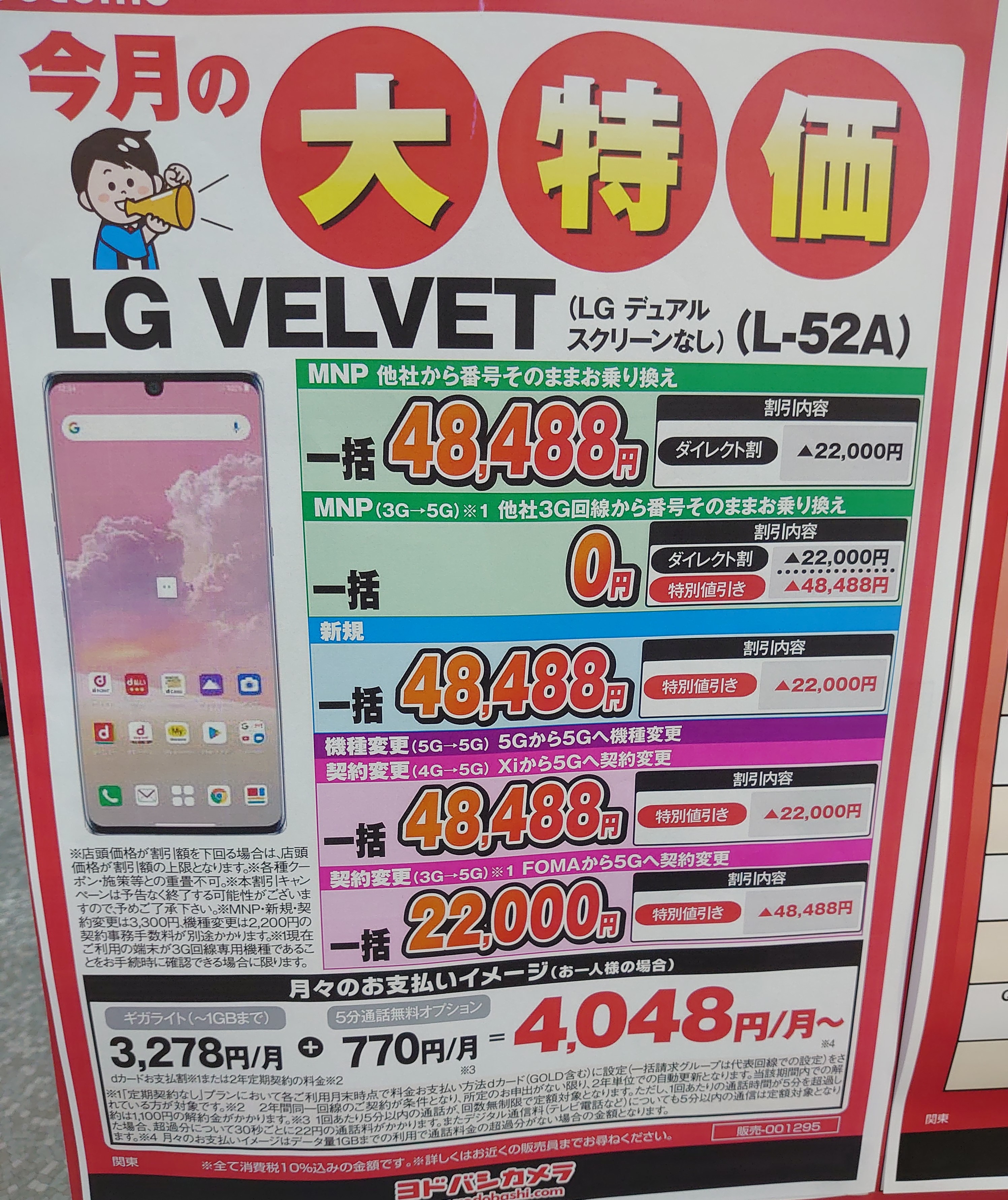 ヨドバシカメラ梅田では、ドコモ「LG VELVET L-52A(税込70,488円)」が他社3GからのMNPで一括0円となっています。LGデュアルスクリーン無し版です。