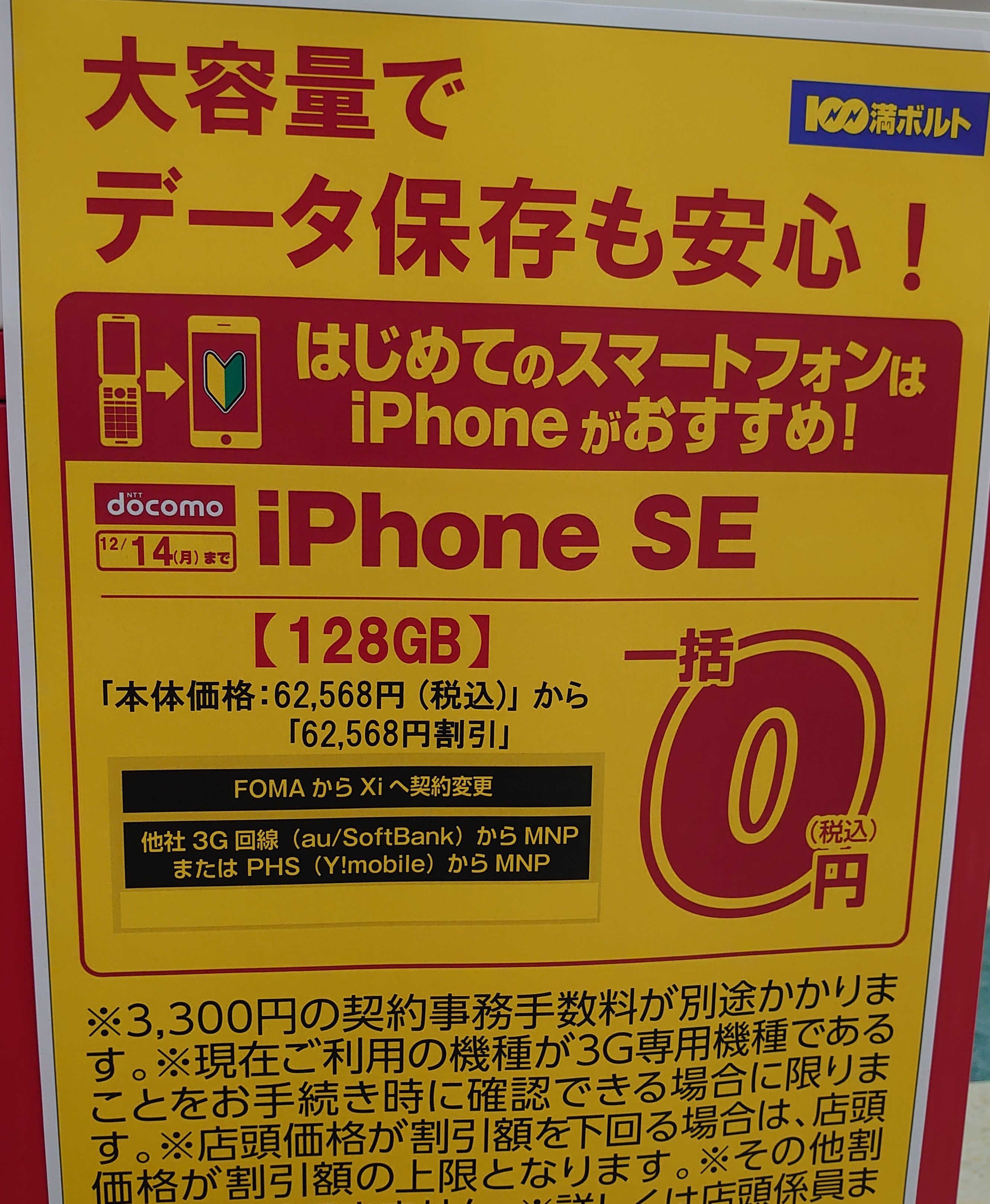 100満ボルトでは、ドコモのiPhone SE(第2世代)128GBが、62,568円割引の一括0円となっています。条件はFOMAからの契約変更、若しくは他社3GからのMNPです。12月14日(月)まで。