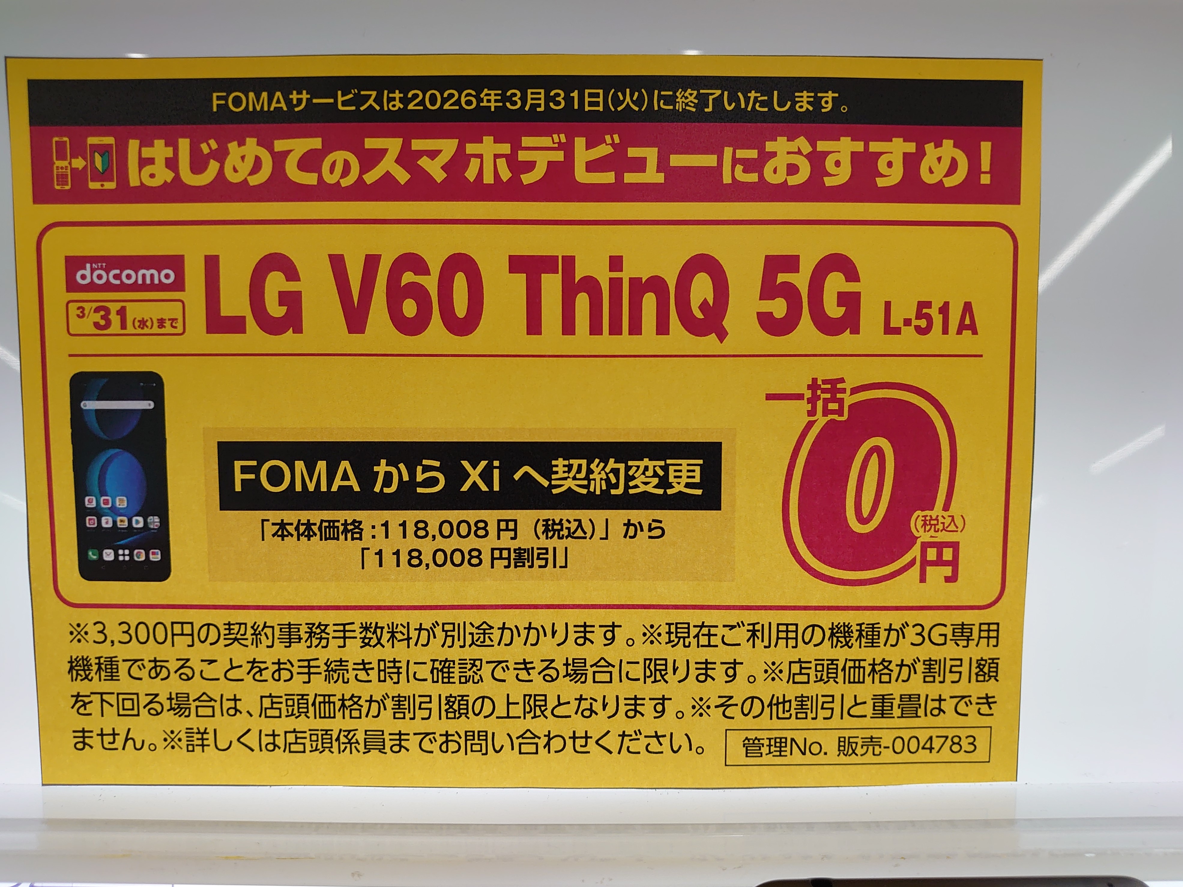 年度末になりドコモはエンジンがかかってきました。2020年5月発売の5G対応「LG V60 ThinQ 5G L-51A」が118,008円割引の一括0円です。条件は「FOMAからの契約変更」のみ、他社3GからのMNPは0円対象外とのことです。3月31日(水)まで。