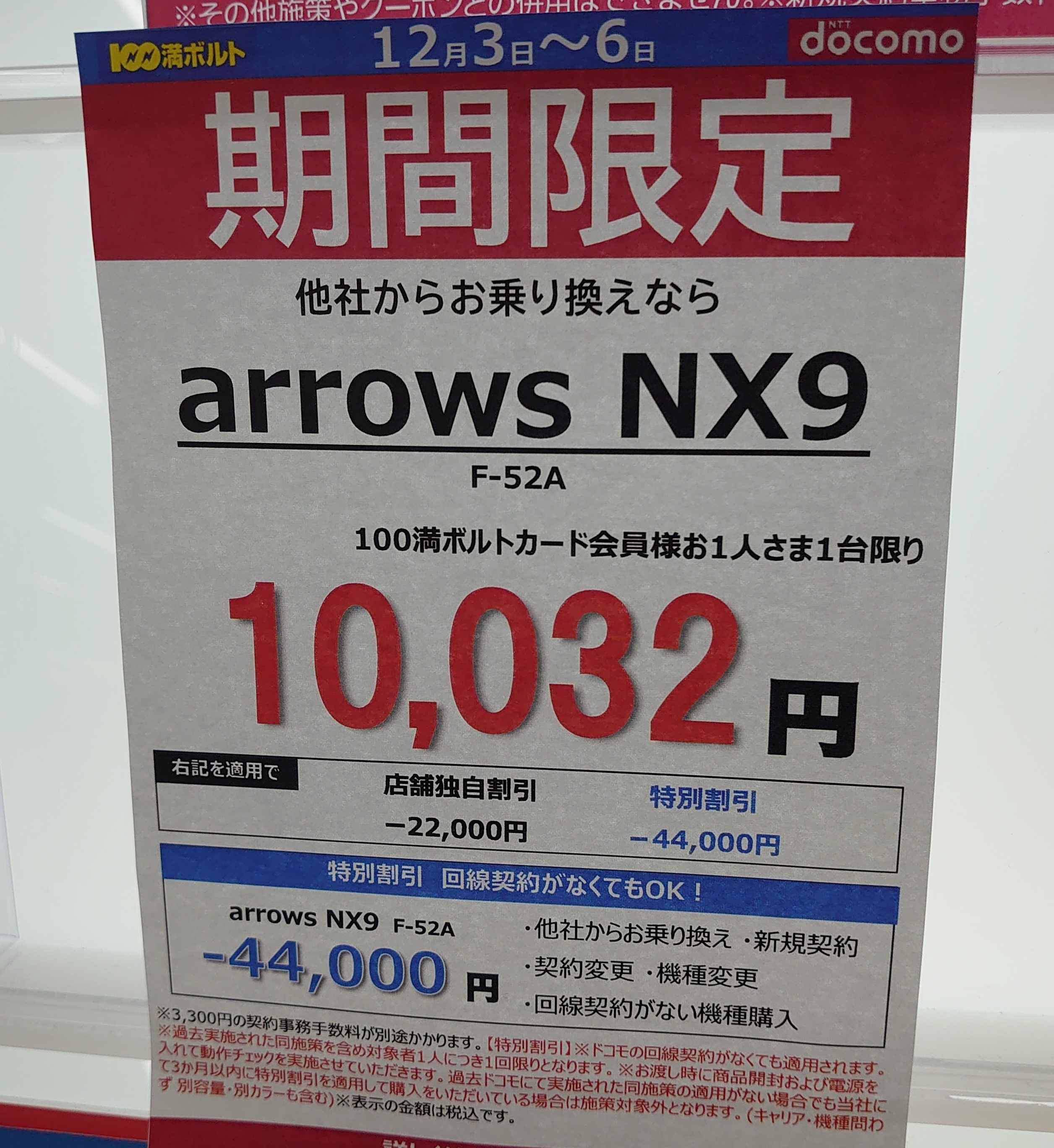 北陸地方の100満ボルトでは、ドコモ「arrows NX9 F-52A(税込76,032円)」がMNP66,000円割引で、一括10,032円(税込)となっています。