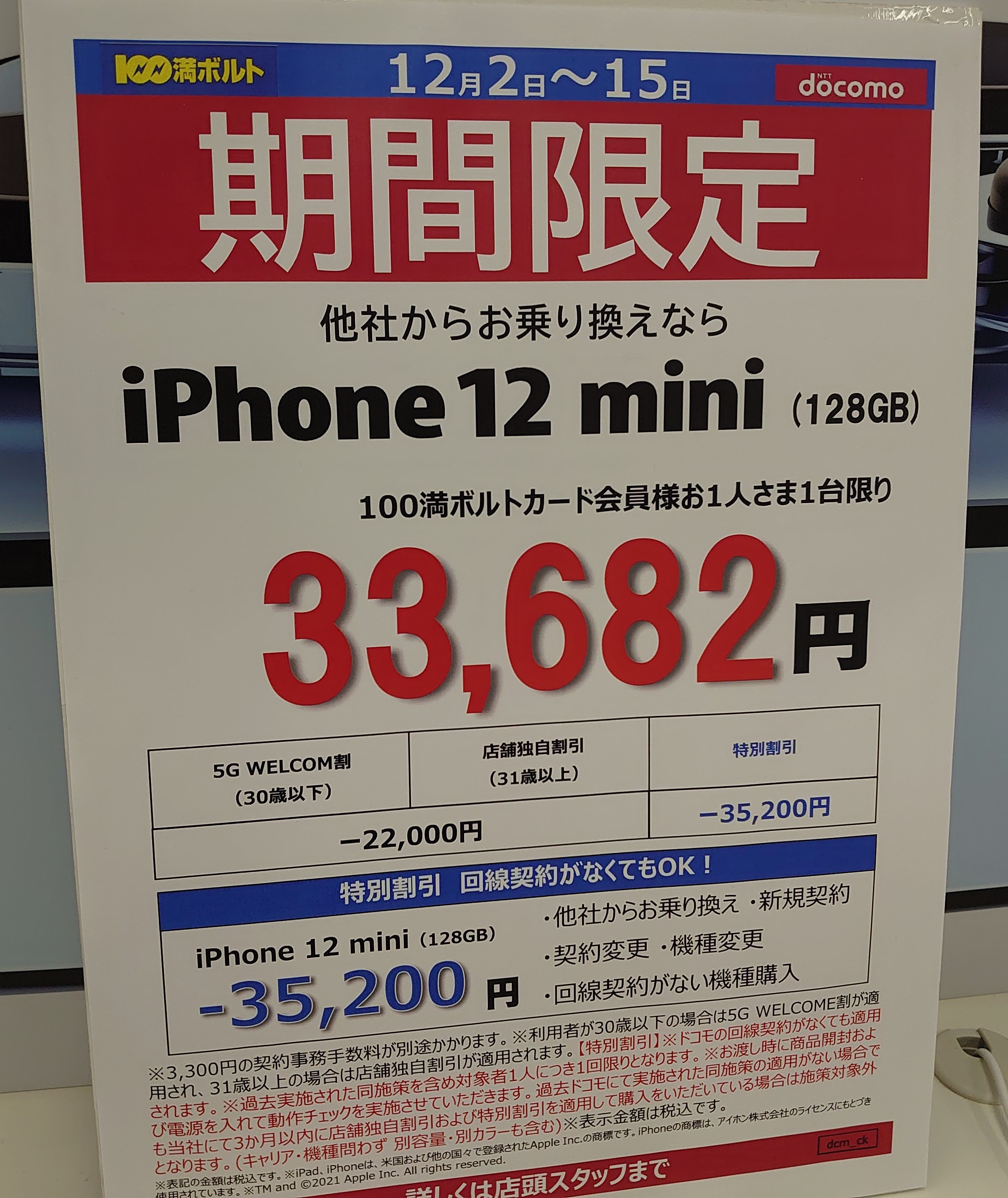 そして、「iPhone 12 mini 128GB」はMNP一括33,682円(税込)です。どこでもやってるじゃないかとお思いかもしれませんが、よくよく見ると一般相場より2,000円だけ安いです。他店では概ね35,682円となっていると思います。