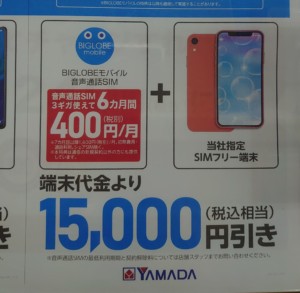 ヨドバシカメラ、ビックカメラに続き、ヤマダ電機でもドコモSIM単体契約(MNP)でSIMフリースマホが20,000円割引(税別価格から)です。期間は12月31日まで。