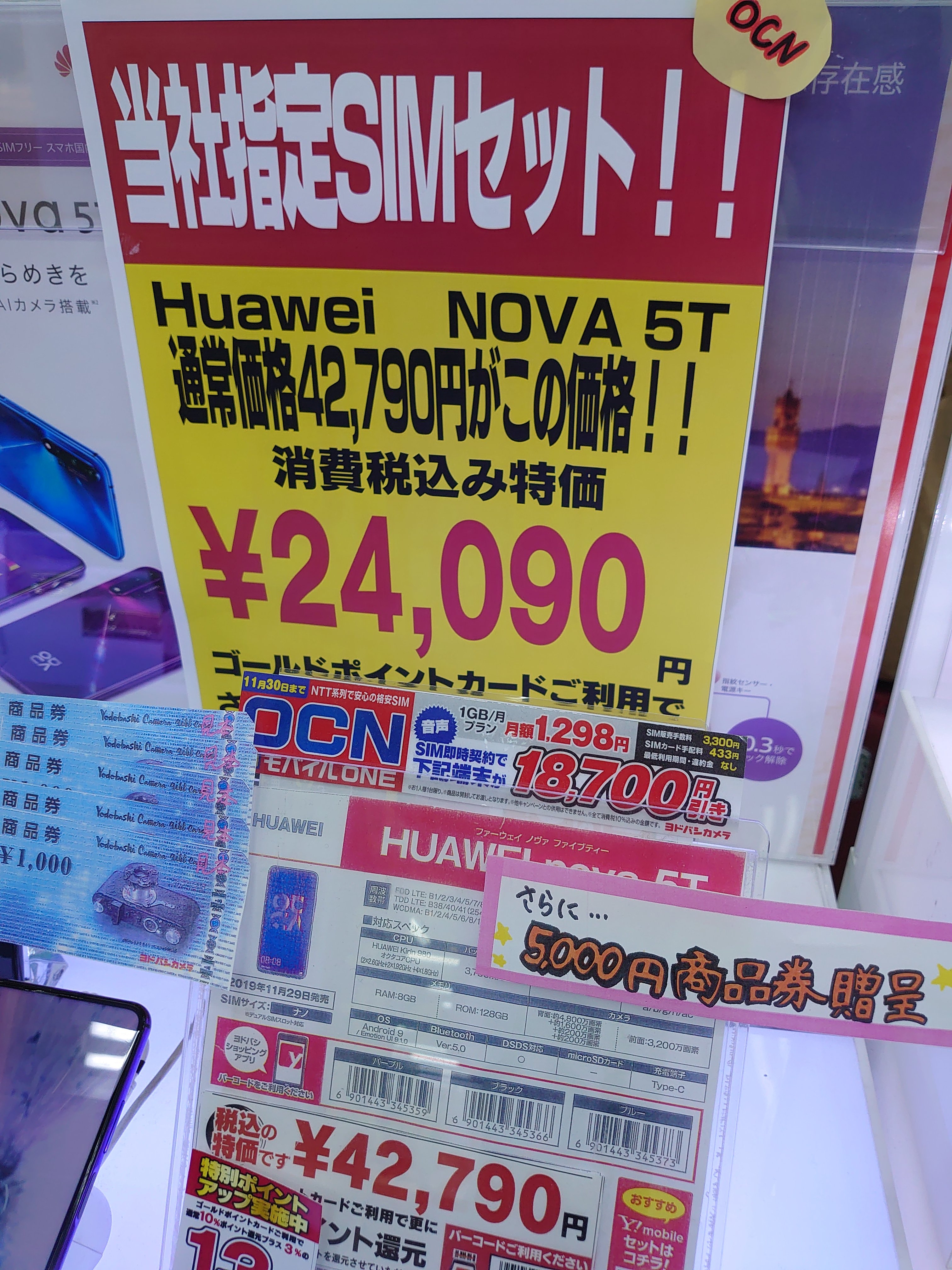 HUAWEI nova 5TがOCNで24,090円/ポイント13%/さらに商品券5,000円/ヨドバシ梅田 2020 11/28 SIMフリー 2020年11月28日 当ページにはアフィリエイト広告が含まれています。 2020年11月28日(土)確認。 商品券は端末割引には使用出来ないとのことです。 OCNの事務手数料は3,300円、SIM手配料433円。最低利用期間はなし。契約解除に伴う違約金もありません(新コース)。 SIMフリー よかったらシェアしてね! URLをコピーしました! URLをコピーしました! この記事を書いた人 Sakura R5G ケータイ特価情報をお届けします。 遠慮なくコメント頂ければ結構ですが、コメントは私が承認するまで表示されませんので、ご注意下さい。 ※2024年7月1日より、参考程度の投稿以外はX(旧ツイッター)に投稿しようと思っています。 人気記事 ワイモバイル 【8/14(木)より】価格(再)更新、ワイモバイル「Google Pixel 8a」が機種変更で49,536円にPayPay還元/事務手数料0円/ヤフーショッピング店 2025年8月14日 ワイモバイル 【1/21(水)より】ワイモバイル「iPhone 13(認定中古品)」、機種変更一括29,520円が再開/事務手数料3,850円/オンラインストア 2026年1月21日 楽天モバイル 【2025/12版】楽天モバイル「nubia S2R」や「Galaxy A25 5G」がMNP一括1円/事務手数料0円 2025年12月2日 ドコモ 【2025/8版】ahamoへのSIMのみMNPで20,000dポイント(分割進呈)/事務手数料0円/NTTドコモ 2025年8月10日 楽天モバイル 【7/1(火)より】楽天モバイルへのMNPで▲22,000円割引/「Nothing Phone (3a)」が一括32,890円など/事務手数料0円 2025年7月1日 新着記事 【1/25(日)まで】エディオンSIMへのMNPで17,000ポイント還元/事務手数料0円/ビッグローブ 【2026/1版】ソフトバンク「Google Pixel 10」がU18純新規で▲43,176円割引にPayPayガチャ最大20,000円還元 【1/26(月)まで】エディオンでキャリアスマホ5,000円OFFクーポン配布(2.2万円以上割引との併用は不可) コメント コメントする コメントをキャンセルコメント ※ 名前 メール サイト 新しいコメントをメールで通知 新しい投稿をメールで受け取る