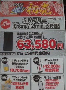 エディオンなんば本店では、初売特価(2021年1月11日まで)で、SIMフリーの「iPhone 12 mini」が新規・MNPともに18,700円割引です。