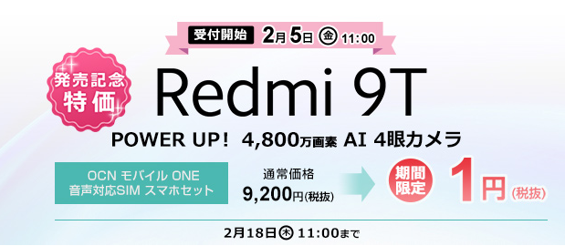 Redmi 9Tについては、2021年2月5日(金)11時より販売を開始。特価1円で、こちらは2月18日(木)11:00まで。Redmi 9Tは本体価格が安いので、普通にamazonや量販店等で端末のみ購入でもいいと思います。