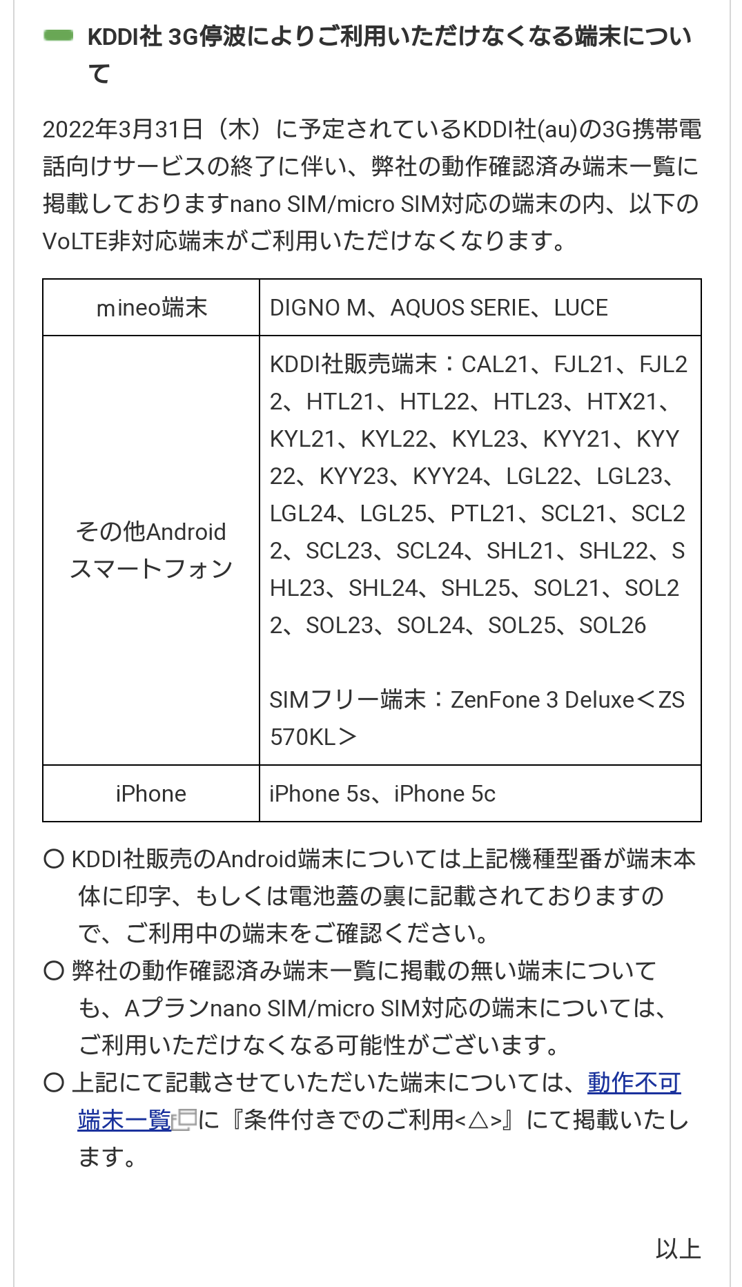 3G停波により、マイネオで動作確認がとれているiPhone 5s、iPhone 5c、Xperia Z3 SOL26などの3G通話は出来なくなりますのでご注意下さい。