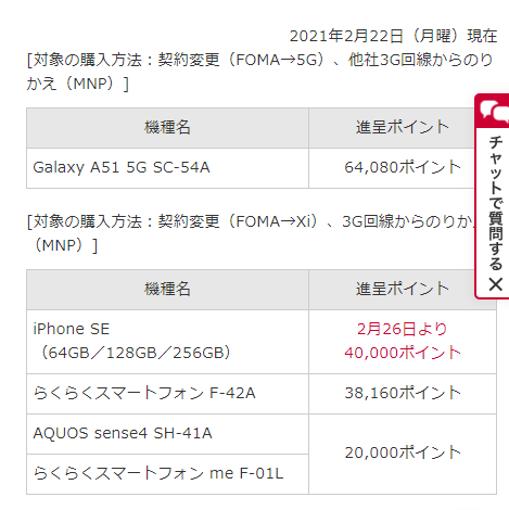 ドコモオンラインショップでは、iPhone SE(64GB、128GB、256GB)のはじめてスマホ購入サポート(FOMAからの契約変更、他社3GからのMNP)による還元dポイントが、2021年2月26日(金)から40,000ポイントとなります。これで、例えば64GB版は実質17,024円(税込)です。