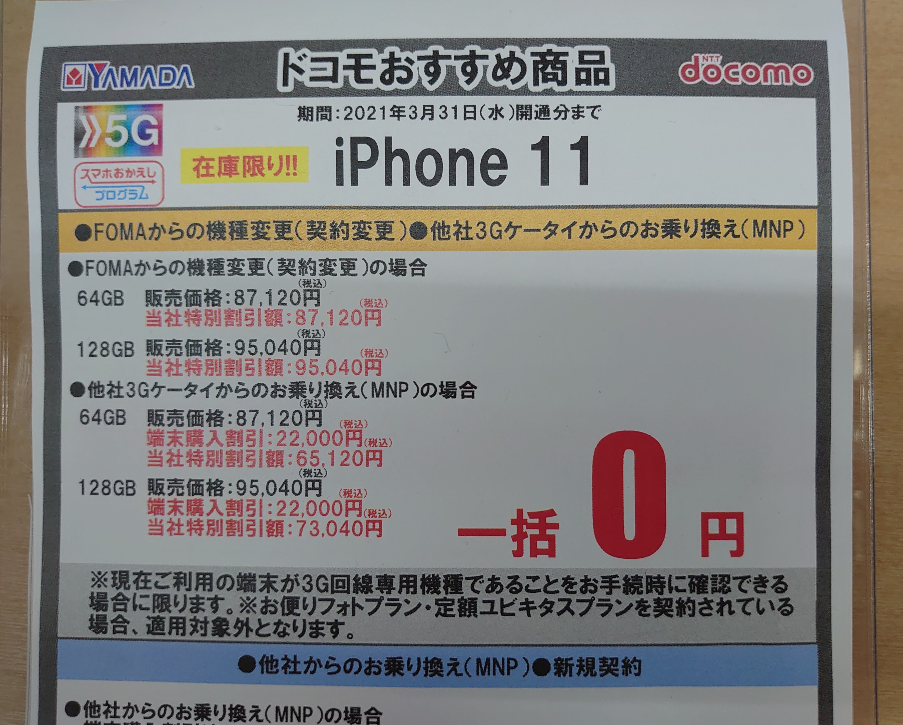 2021年2月末から在庫処分特価となっているヤマダ電機のドコモ「iPhone 11シリーズ」ですが、3月も引き続き「iPhone 11 64GB・128GB」が一括0円です。条件はFOMAからの契約変更、若しくは他社3GからのMNPです。3月31日まで。