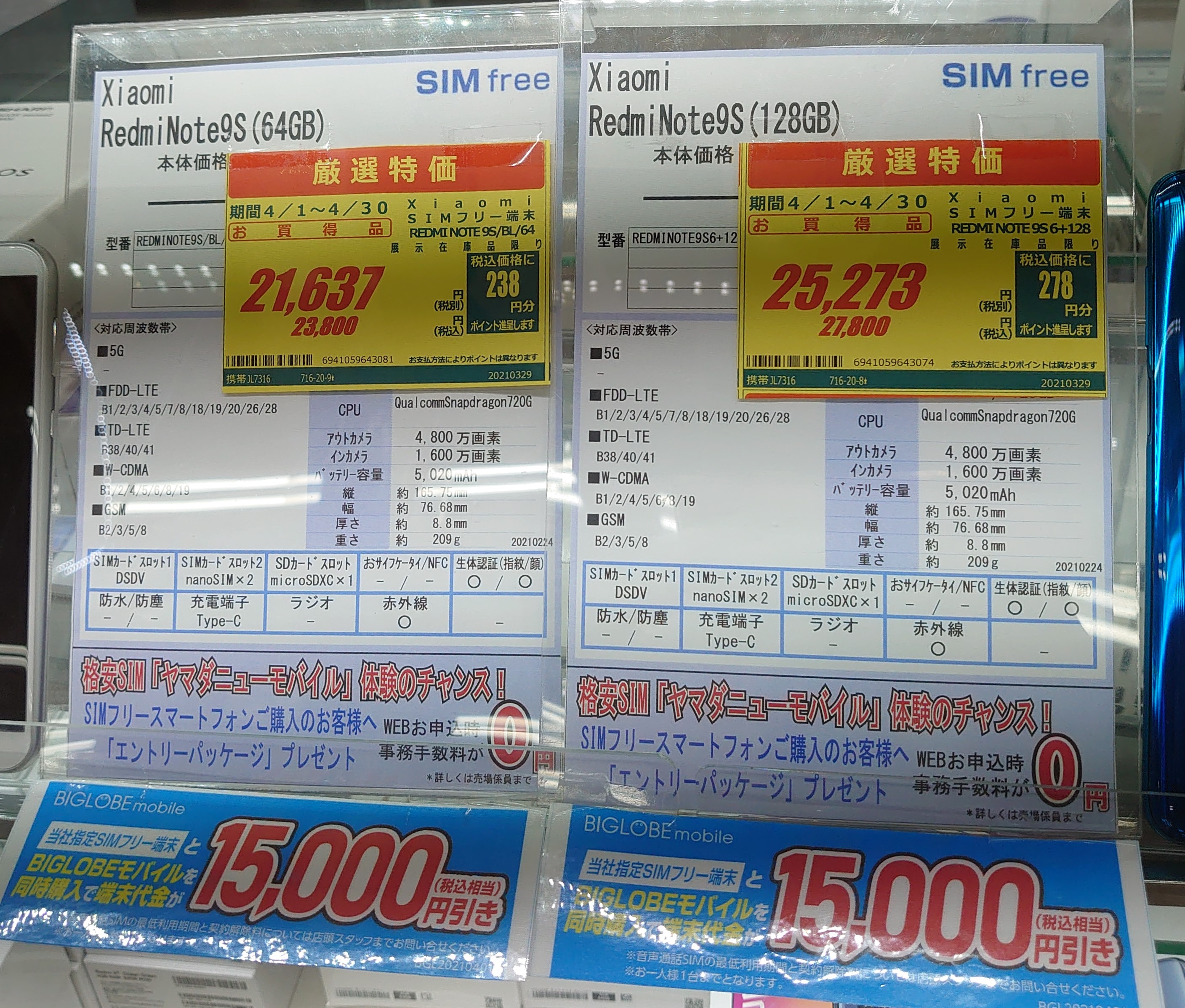 人気を博し新品での入手がなかなか難しくなっている「Xiaomi Redmi Note 9S」ですが、ヤマダデンキLABI1なんば店では、まだまだビッグローブセットで割安で新品が入手出来ます。