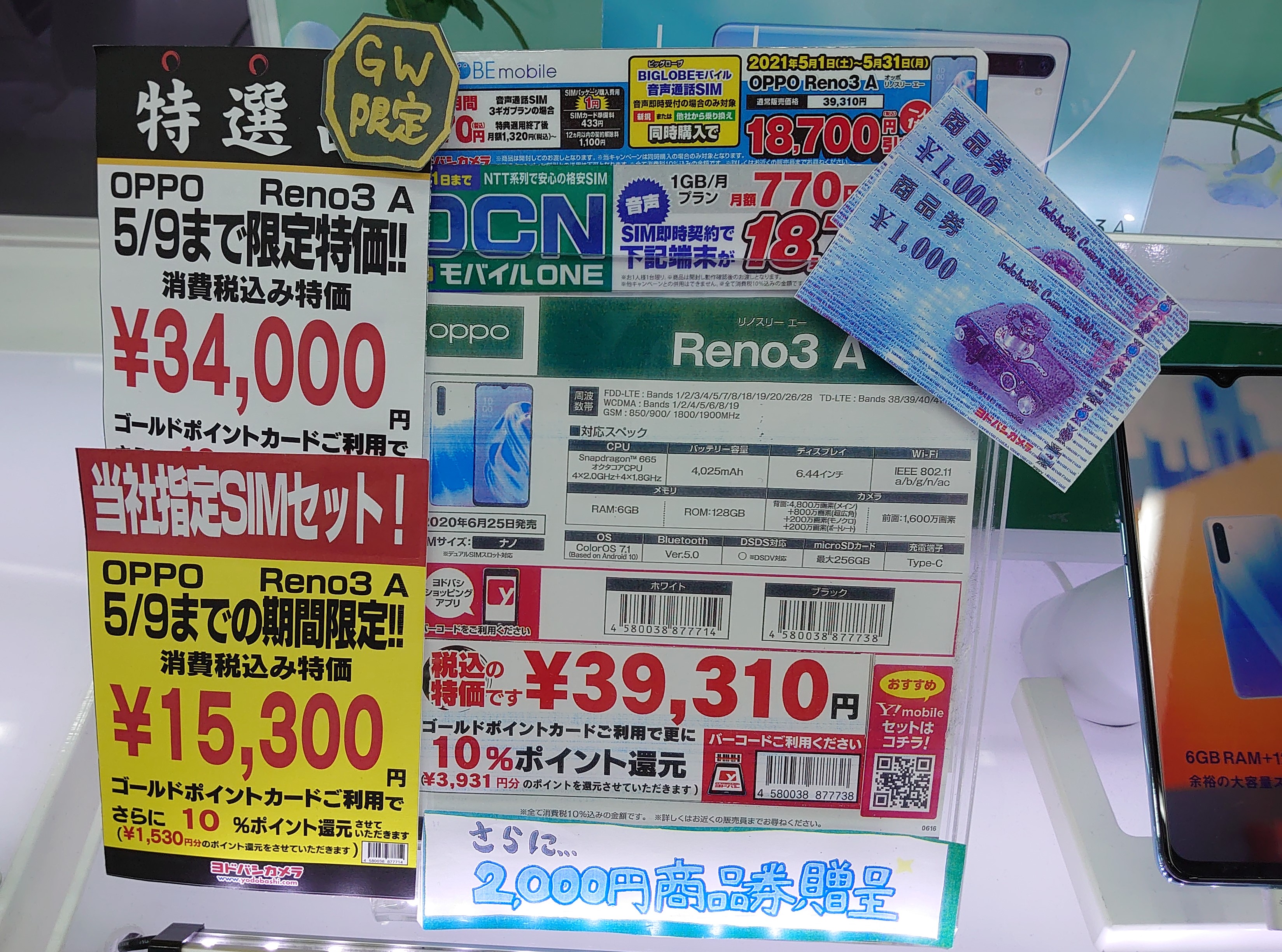 ヨドバシカメラ梅田では、「OPPO Reno3 A」がビッグローブ、OCNモバイルONE契約で一括15,300円(税込)となっています。ポイントは10%、商品券2,000円付です。また、BIGLOBEモバイルでは、税込34,056円で20,000ポイント還元となっています。