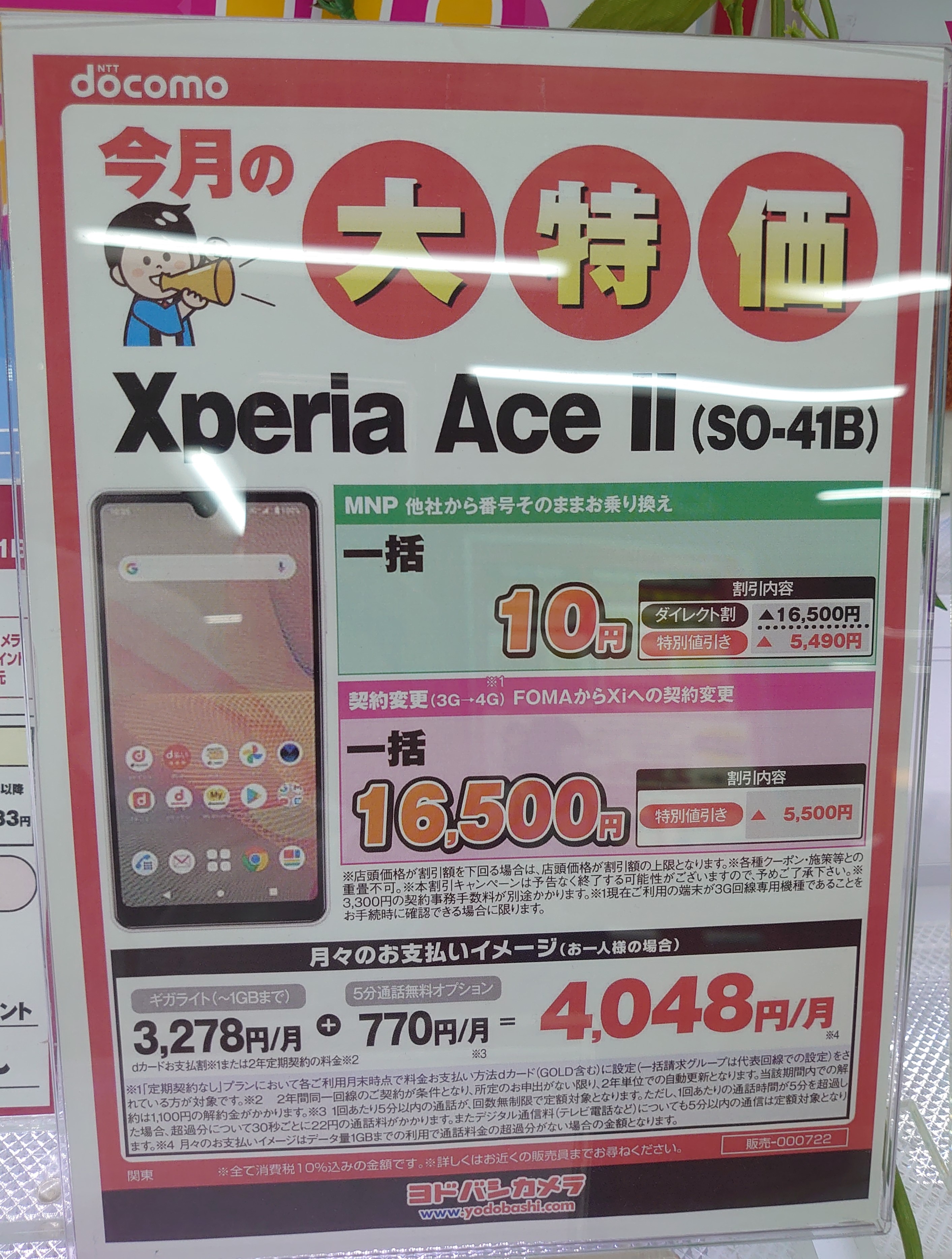 ヨドバシカメラ、ビックカメラ、ヤマダ電機、ケーズデンキなどでは、5月28日発売の「Xperia Ace II SO-41B(税込22,000円)」がMNPで一括1円~10円となっています。 ドコモの端末購入割引が16,500円、残りが店舗独自割引です。各店、今のところ新規契約・機種変更契約での割引は入っていないようです。
