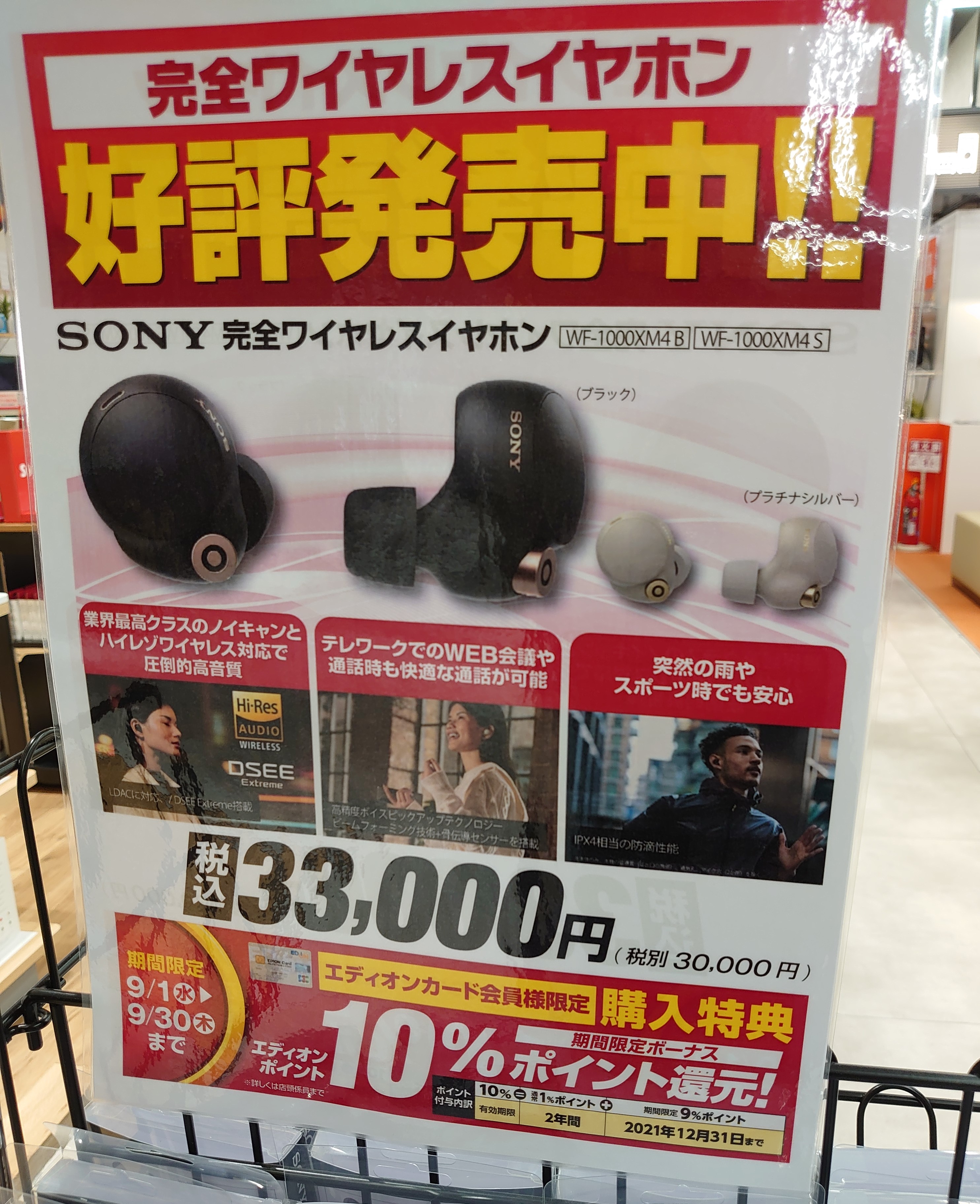 LDAC対応の完全ワイヤレスイヤホンSONY「WF-1000XM4」ですが、9/4(土)時点ではビックカメラなんば店やエディオンなんば本店等にも在庫がありました。ブラックもあります。こちらはポイント10%(3,300ポイント)還元です。