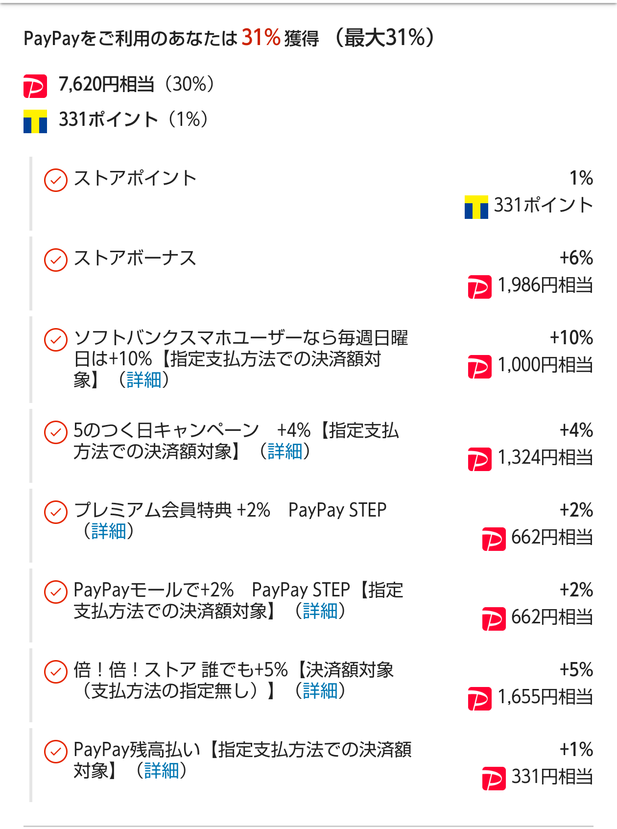 PayPay残高支払、PayPay連携、プレミアム会員、倍!倍!ストア店購入(エントリー必要)などの条件は必要となります。下記で言えば、有料のプレミアム会員+2%ポイント以外は、エントリー等で誰でも獲得出来ます。私が獲得しているソフトバンクユーザー+10%(上限1,000円)ですが、「SBスマホユーザーじゃなくても+5%」で、ソフトバンクユーザーでなくても1,000円相当は獲得可能です。