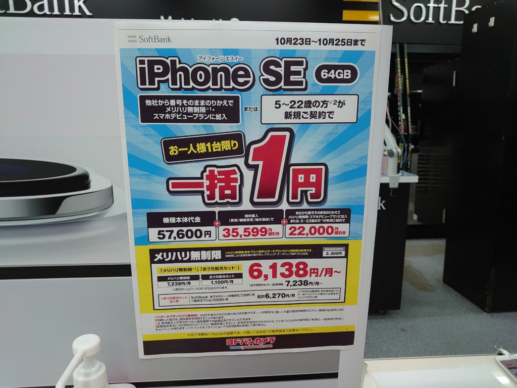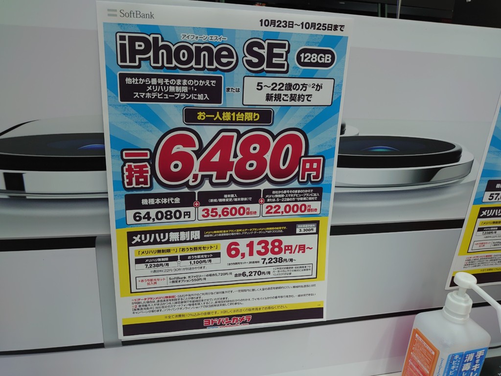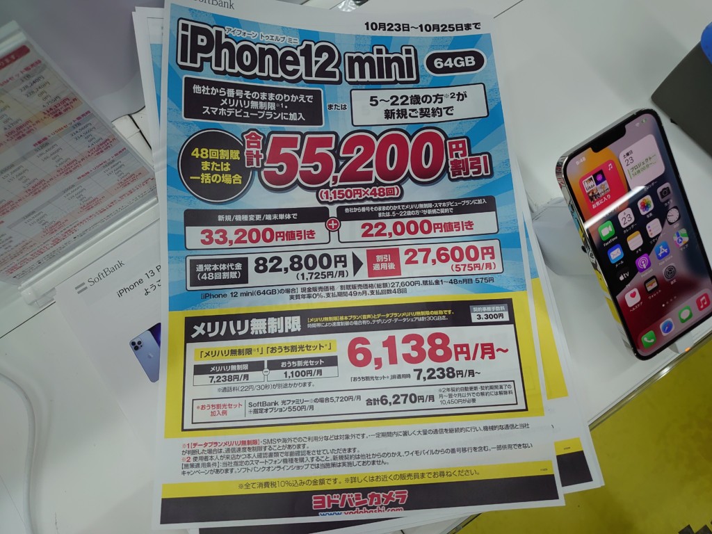 ソフトバンクiPhone 12 miniがMNP一括27,600円/ヨドバシカメラ梅田 2021 10/23 ソフトバンク 2021年10月23日 当ページにはアフィリエイト広告が含まれています。 MNPでスマホデビュープランを適用させるのもいいですし(他社3Gガラケー、4Gケータイ持参必須)、端末のみ購入でもいいと思います。但し、端末のみの場合、22,000円割引は入りません。2021年10月25日まで。 ソフトバンク よかったらシェアしてね! URLをコピーしました! URLをコピーしました! この記事を書いた人 Sakura R5G ケータイ特価情報をお届けします。 遠慮なくコメント頂ければ結構ですが、コメントは私が承認するまで表示されませんので、ご注意下さい。 ※2024年7月1日より、参考程度の投稿以外はX(旧ツイッター)に投稿しようと思っています。 人気記事 ワイモバイル 【8/14(木)より】価格(再)更新、ワイモバイル「Google Pixel 8a」が機種変更で49,536円にPayPay還元/事務手数料0円/ヤフーショッピング店 2025年8月14日 ワイモバイル 【2025/11版】ワイモバイル「iPhone 13(認定中古品)」が機種変更一括29,520円/事務手数料3,850円/オンラインストア 2025年11月9日 楽天モバイル 【2025/12版】楽天モバイル「nubia S2R」や「Galaxy A25 5G」がMNP一括1円/事務手数料0円 2025年12月2日 ドコモ 【2025/8版】ahamoへのSIMのみMNPで20,000dポイント(分割進呈)/事務手数料0円/NTTドコモ 2025年8月10日 楽天モバイル 【7/1(火)より】楽天モバイルへのMNPで▲22,000円割引/「Nothing Phone (3a)」が一括32,890円など/事務手数料0円 2025年7月1日 新着記事 【1/10(土)】 Joshin webで「Xiaomi 14T Pro 512GB(パッケージ不良)」が79,800円 【1/15(木)発売】楽天モバイル「Nothing Phone (3a) Lite」が32,890円/はじめて申し込み&MNPで16,000ポイント/2回線目以降は新規で6,000ポイント 【1/13(火)まで】UQモバイル「自宅セット割」適用で10,000ポイント追加還元/ビックカメラ コメント コメントする コメントをキャンセルコメント ※ 名前 メール サイト 新しいコメントをメールで通知 新しい投稿をメールで受け取る
