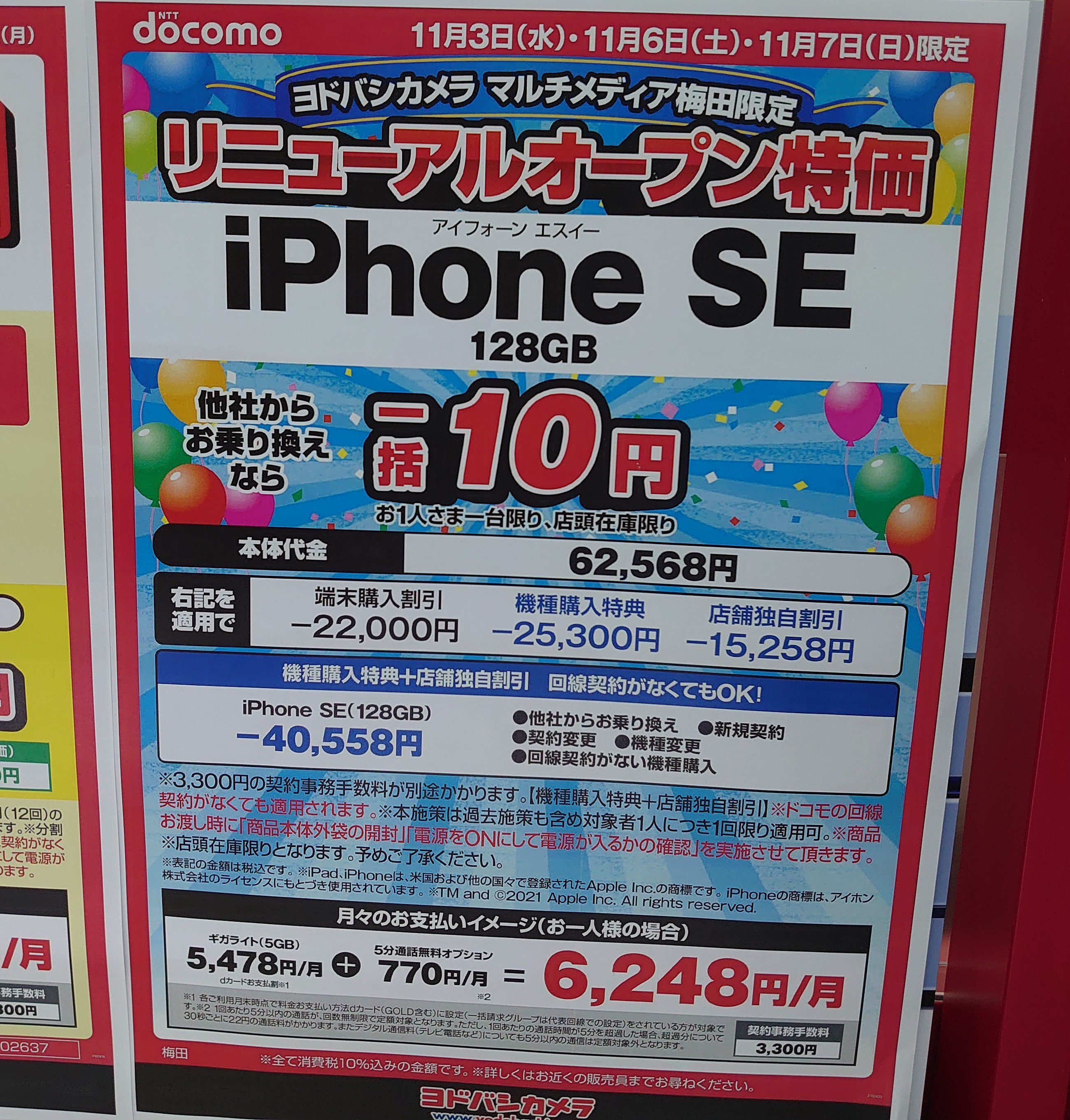 【11/6】ドコモ iPhoneSE 128GBがMNP一括10円/ヨドバシ梅田 2021 11/07 ドコモ 2021年11月6日2021年11月7日 当ページにはアフィリエイト広告が含まれています。 11/3(水)、11/6(土)、11/7(日)梅田限定のようです。端末のみ購入、機種変更は22,010円(税込)です。土曜日ですが機種変更だけで相当の待ち人数でしたので、日曜日には在庫は無くなっているかもしれません。 ドコモ よかったらシェアしてね! URLをコピーしました! URLをコピーしました! この記事を書いた人 Sakura R5G ケータイ特価情報をお届けします。 遠慮なくコメント頂ければ結構ですが、コメントは私が承認するまで表示されませんので、ご注意下さい。 ※2024年7月1日より、参考程度の投稿以外はX(旧ツイッター)に投稿しようと思っています。 人気記事 ワイモバイル 【8/14(木)より】価格(再)更新、ワイモバイル「Google Pixel 8a」が機種変更で49,536円にPayPay還元/事務手数料0円/ヤフーショッピング店 2025年8月14日 ワイモバイル 【2025/11版】ワイモバイル「iPhone 13(認定中古品)」が機種変更一括29,520円/事務手数料3,850円/オンラインストア 2025年11月9日 楽天モバイル 【2025/12版】楽天モバイル「nubia S2R」や「Galaxy A25 5G」がMNP一括1円/事務手数料0円 2025年12月2日 ドコモ 【2025/8版】ahamoへのSIMのみMNPで20,000dポイント(分割進呈)/事務手数料0円/NTTドコモ 2025年8月10日 楽天モバイル 【7/1(火)より】楽天モバイルへのMNPで▲22,000円割引/「Nothing Phone (3a)」が一括32,890円など/事務手数料0円 2025年7月1日 新着記事 【1/10(土)】 Joshin webで「Xiaomi 14T Pro 512GB(パッケージ不良)」が79,800円 【1/15(木)発売】楽天モバイル「Nothing Phone (3a) Lite」が32,890円/はじめて申し込み&MNPで16,000ポイント/2回線目以降は新規で6,000ポイント 【1/13(火)まで】UQモバイル「自宅セット割」適用で10,000ポイント追加還元/ビックカメラ コメント コメントする コメントをキャンセルコメント ※ 名前 メール サイト 新しいコメントをメールで通知 新しい投稿をメールで受け取る
