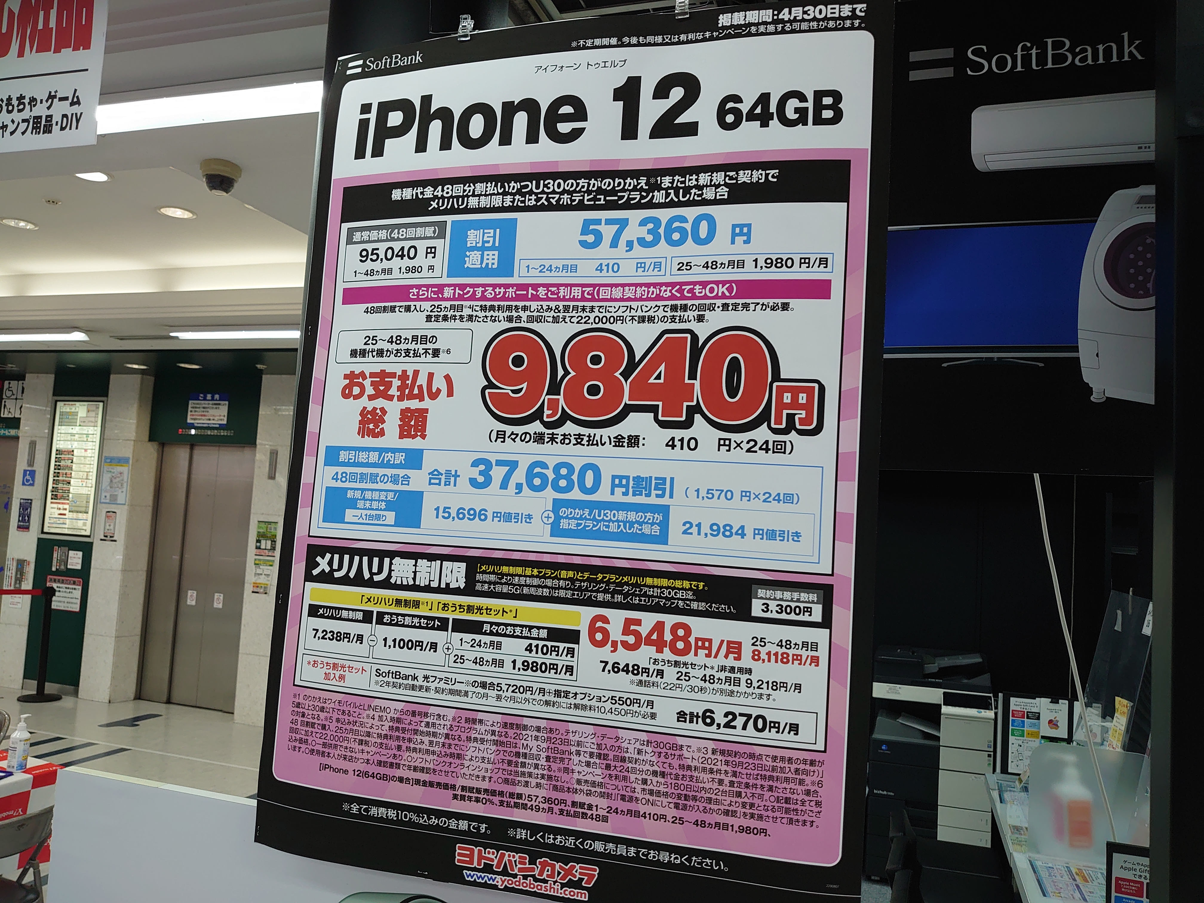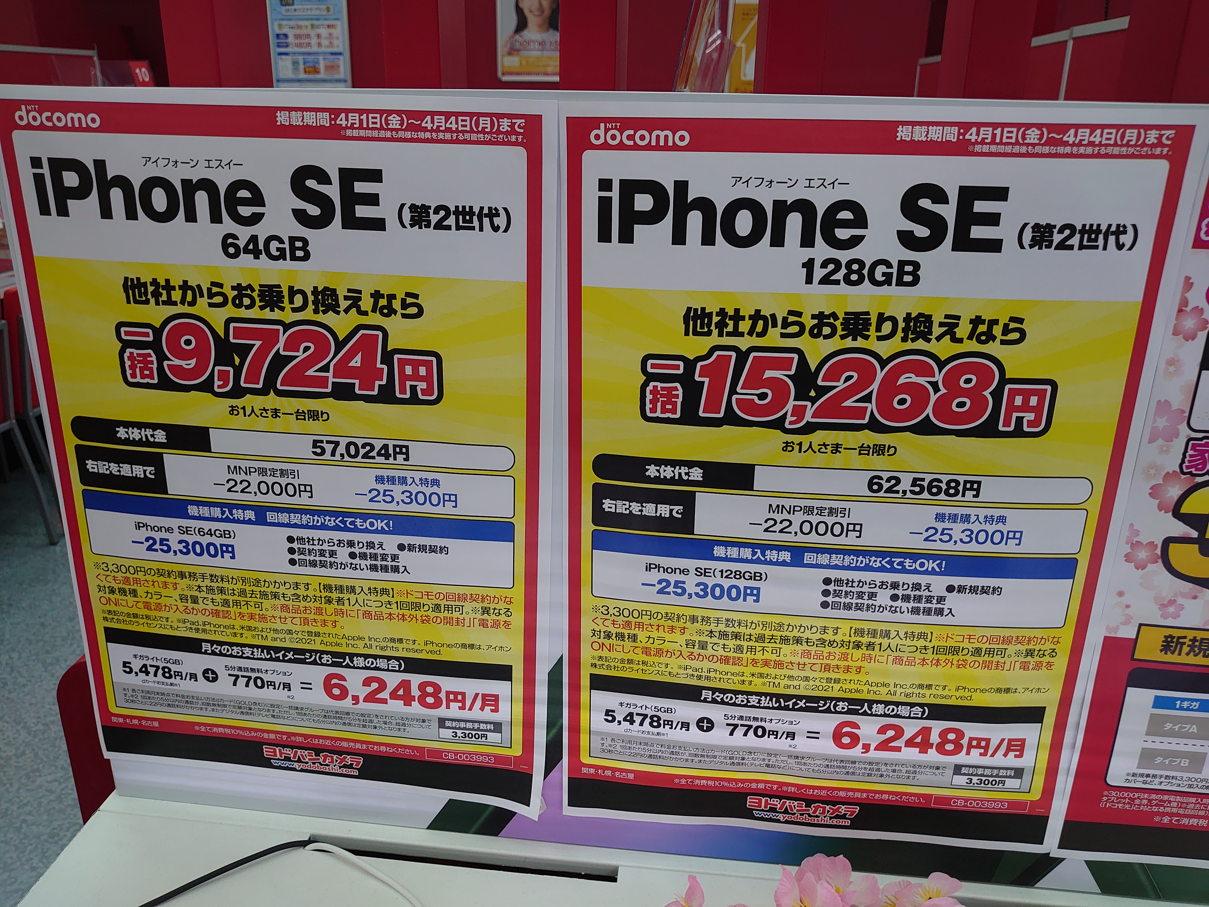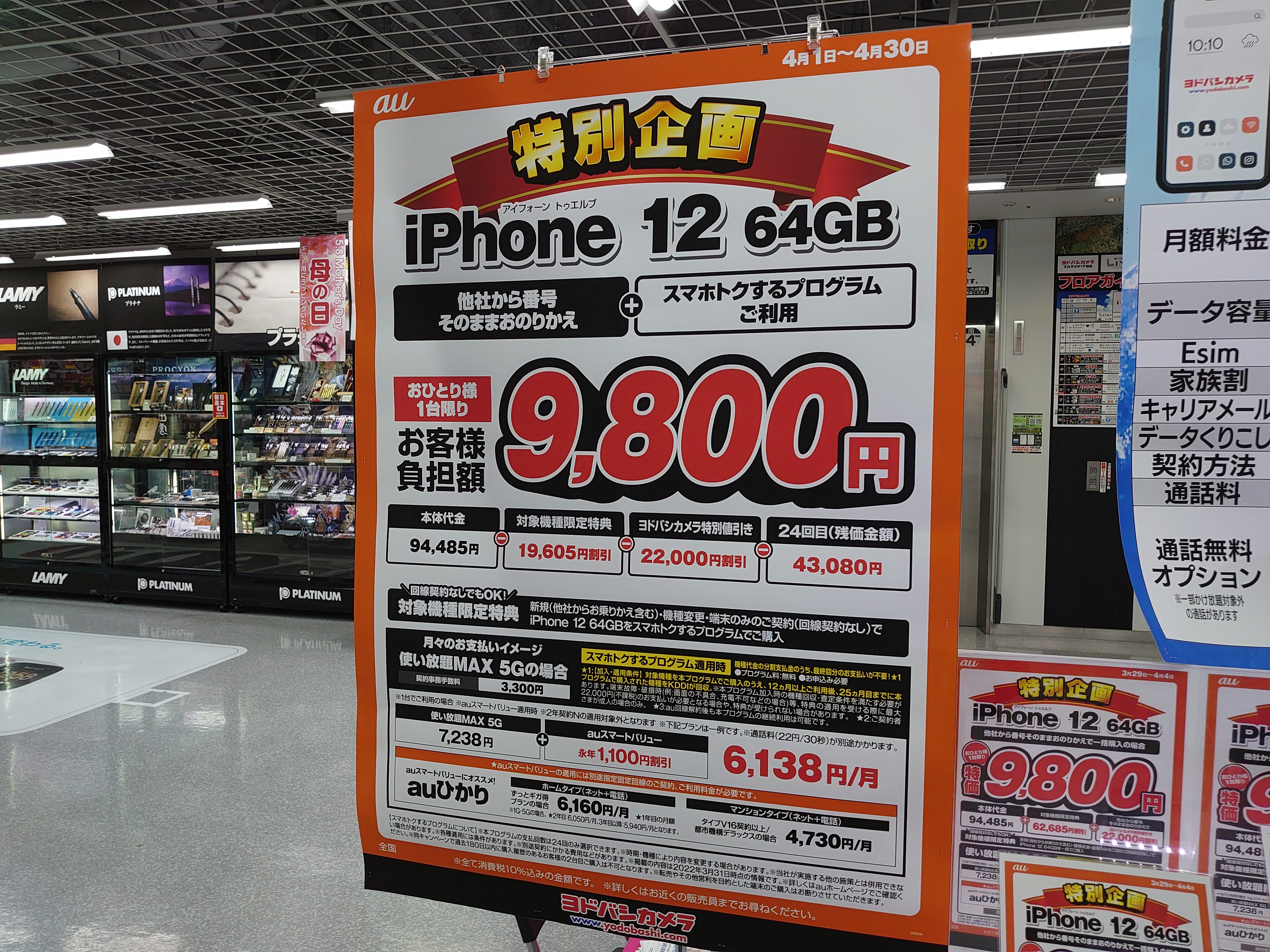 【4/2(土)】iPhoneはドコモSE2、au12以外は一括特価案内無しに/ヨドバシカメラ梅田 2022 4/02 キャリア共通 2022年4月2日 当ページにはアフィリエイト広告が含まれています。 2022年4月2日(土)、ヨドバシカメラ梅田ではau iPhone 12 64GBがMNP一括9,800円(税込)となっています。4/4(月)まで。これでiPhone一括特価はひとまず落ち着くのでしょうか。 キャリア共通 よかったらシェアしてね! URLをコピーしました! URLをコピーしました! この記事を書いた人 Sakura R5G ケータイ特価情報をお届けします。 遠慮なくコメント頂ければ結構ですが、コメントは私が承認するまで表示されませんので、ご注意下さい。 ※2024年7月1日より、参考程度の投稿以外はX(旧ツイッター)に投稿しようと思っています。 人気記事 ワイモバイル 【8/14(木)より】価格(再)更新、ワイモバイル「Google Pixel 8a」が機種変更で49,536円にPayPay還元/事務手数料0円/ヤフーショッピング店 2025年8月14日 ワイモバイル 【2025/11版】ワイモバイル「iPhone 13(認定中古品)」が機種変更一括29,520円/事務手数料3,850円/オンラインストア 2025年11月9日 楽天モバイル 【2025/12版】楽天モバイル「nubia S2R」や「Galaxy A25 5G」がMNP一括1円/事務手数料0円 2025年12月2日 ドコモ 【2025/8版】ahamoへのSIMのみMNPで20,000dポイント(分割進呈)/事務手数料0円/NTTドコモ 2025年8月10日 楽天モバイル 【7/1(火)より】楽天モバイルへのMNPで▲22,000円割引/「Nothing Phone (3a)」が一括32,890円など/事務手数料0円 2025年7月1日 新着記事 【1/10(土)】 Joshin webで「Xiaomi 14T Pro 512GB(パッケージ不良)」が79,800円 【1/15(木)発売】楽天モバイル「Nothing Phone (3a) Lite」が32,890円/はじめて申し込み&MNPで16,000ポイント/2回線目以降は新規で6,000ポイント 【1/13(火)まで】UQモバイル「自宅セット割」適用で10,000ポイント追加還元/ビックカメラ コメント コメントする コメントをキャンセルコメント ※ 名前 メール サイト 新しいコメントをメールで通知 新しい投稿をメールで受け取る