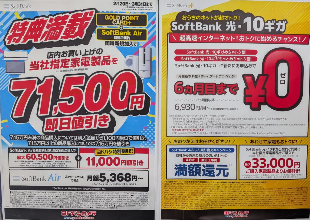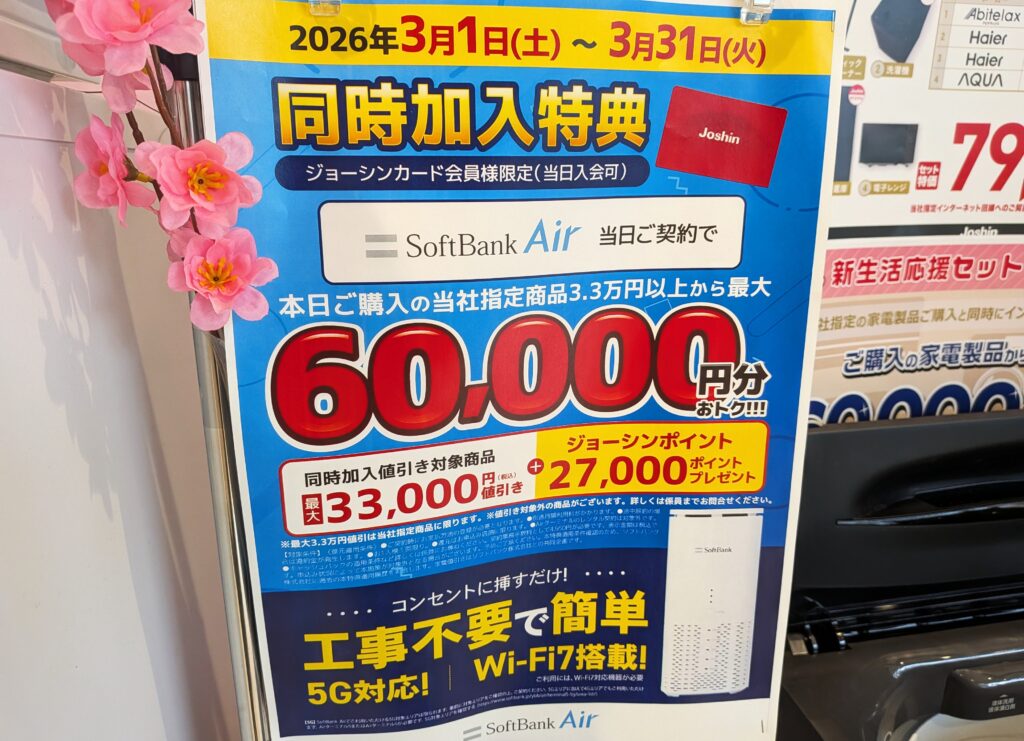 ジョーシンでは「SoftBank Air」の新規契約で家電▲33,000円割引に27,000ポイント還元となっています。事務手数料4,950円(税込)、3/31(火)まで。
