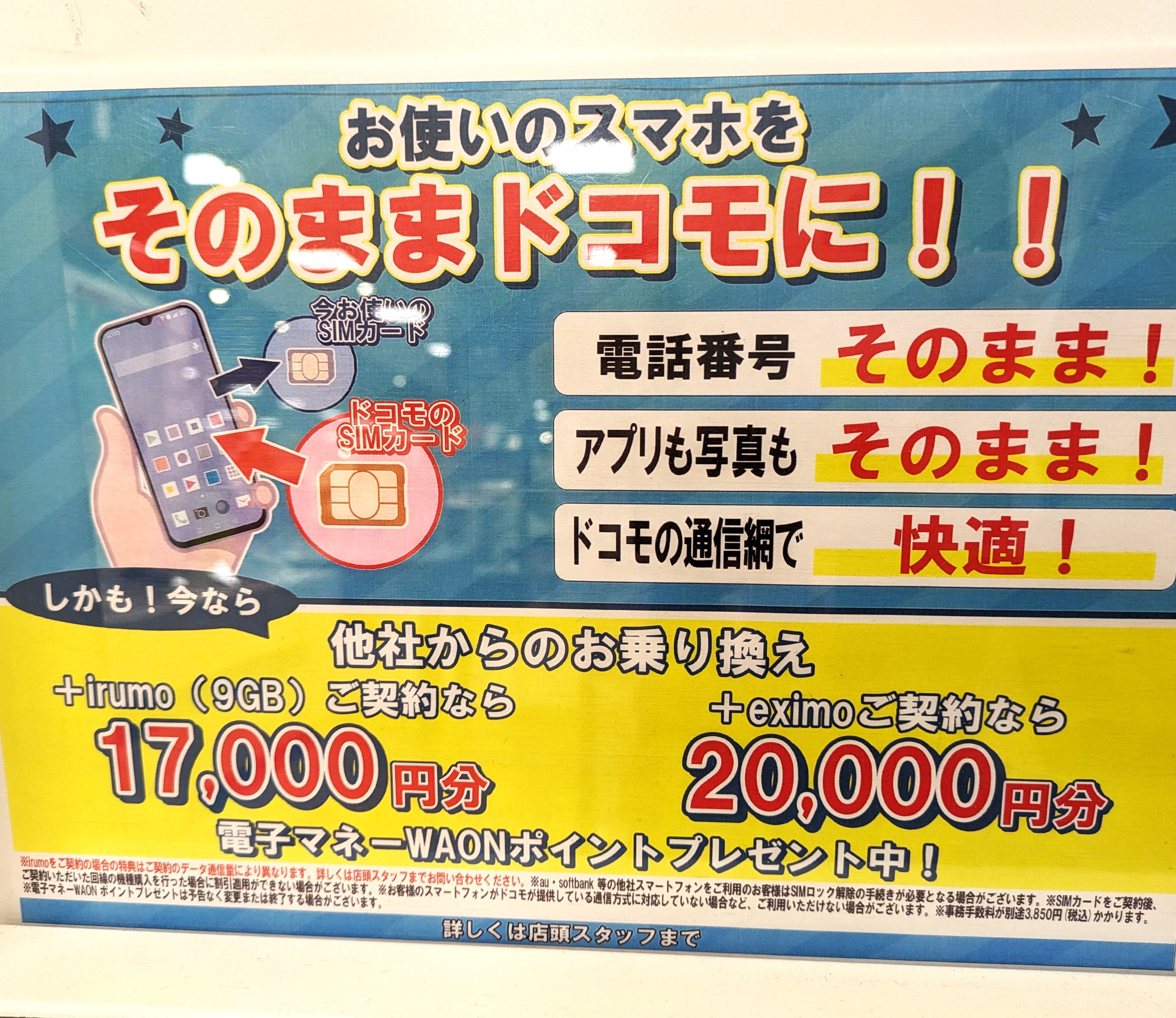 イオンモバイルでは、ドコモのirumo(9GBプラン)へのSIMのみMNPで、17,000円分の電子マネーWAONポイント還元となっています。事務手数料は3,850円(税込)。
