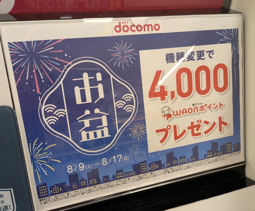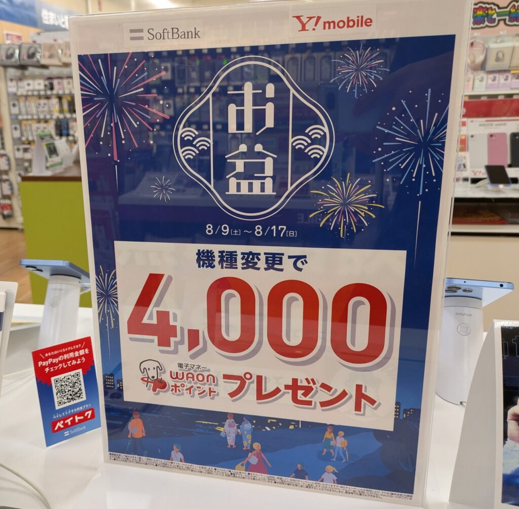 イオンモバイルでは、ドコモ、au、ソフトバンク、UQモバイル、ワイモバイルの機種変更で、4,000ポイント還元となっています。カタカナの電子マネーWAONポイントです。