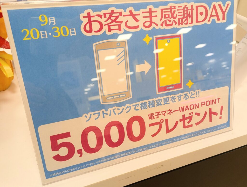 イオンモバイルでは、ソフトバンクの機種変更で、5,000ポイント還元となっています。