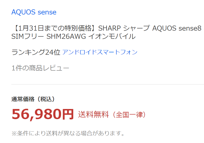 2023年12月1日(金)、イオンモバイルオンラインショップ(Yahoo!店)では「AQUOS sense8 SH-M26」SIMフリーが56,980円(税込)に値下げとなっています。来年1/31(水)まで。59,180円(税込)からの期間限定値下げです。