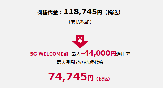 ドコモオンラインショップやahamo公式サイトでは、「iPhone 16 128GB(税込118,745円)」がMNPで▲44,000円割引になり、総額74,745円(税込)となっています。事務手数料は0円(税込)。