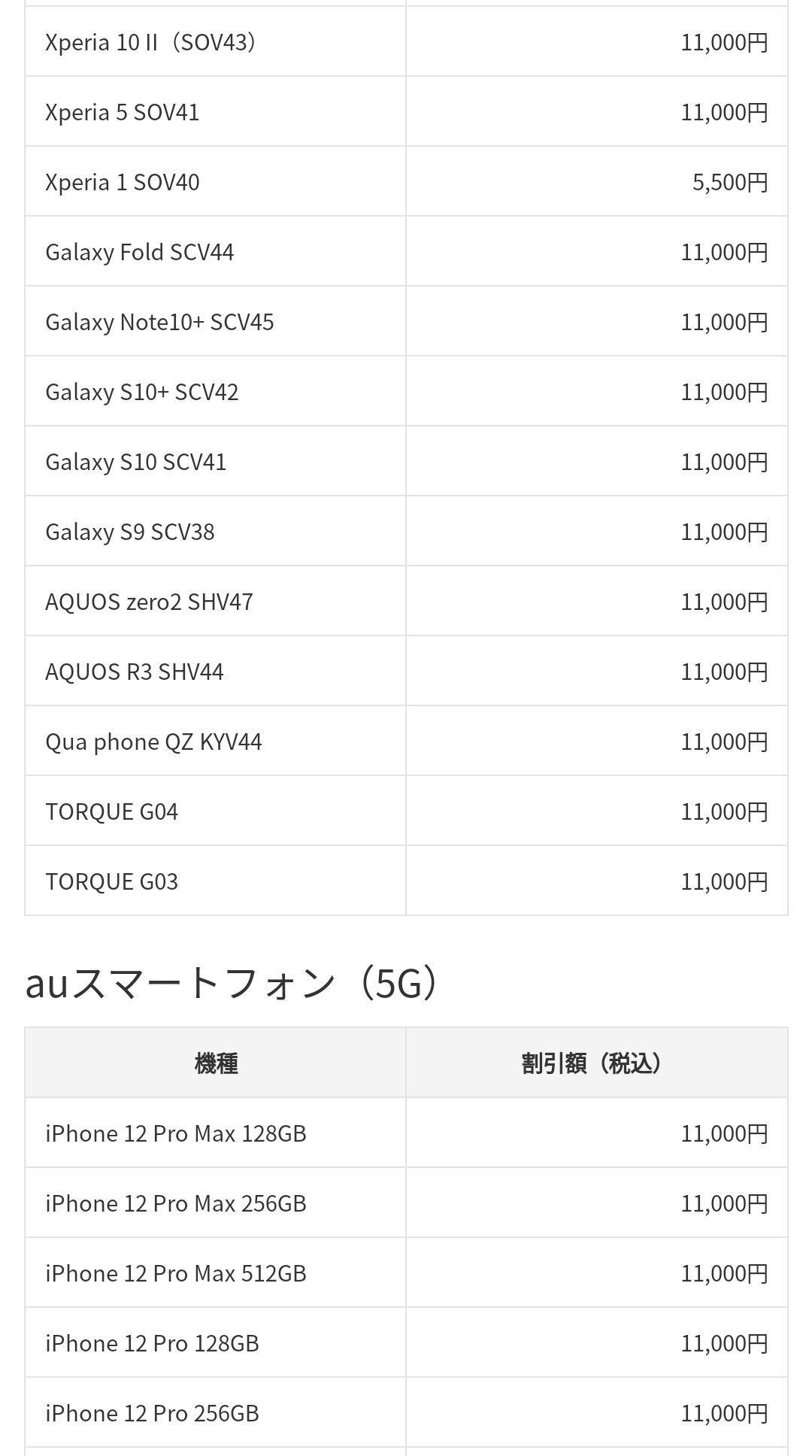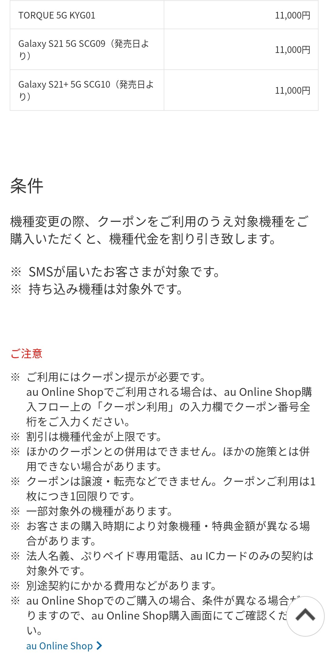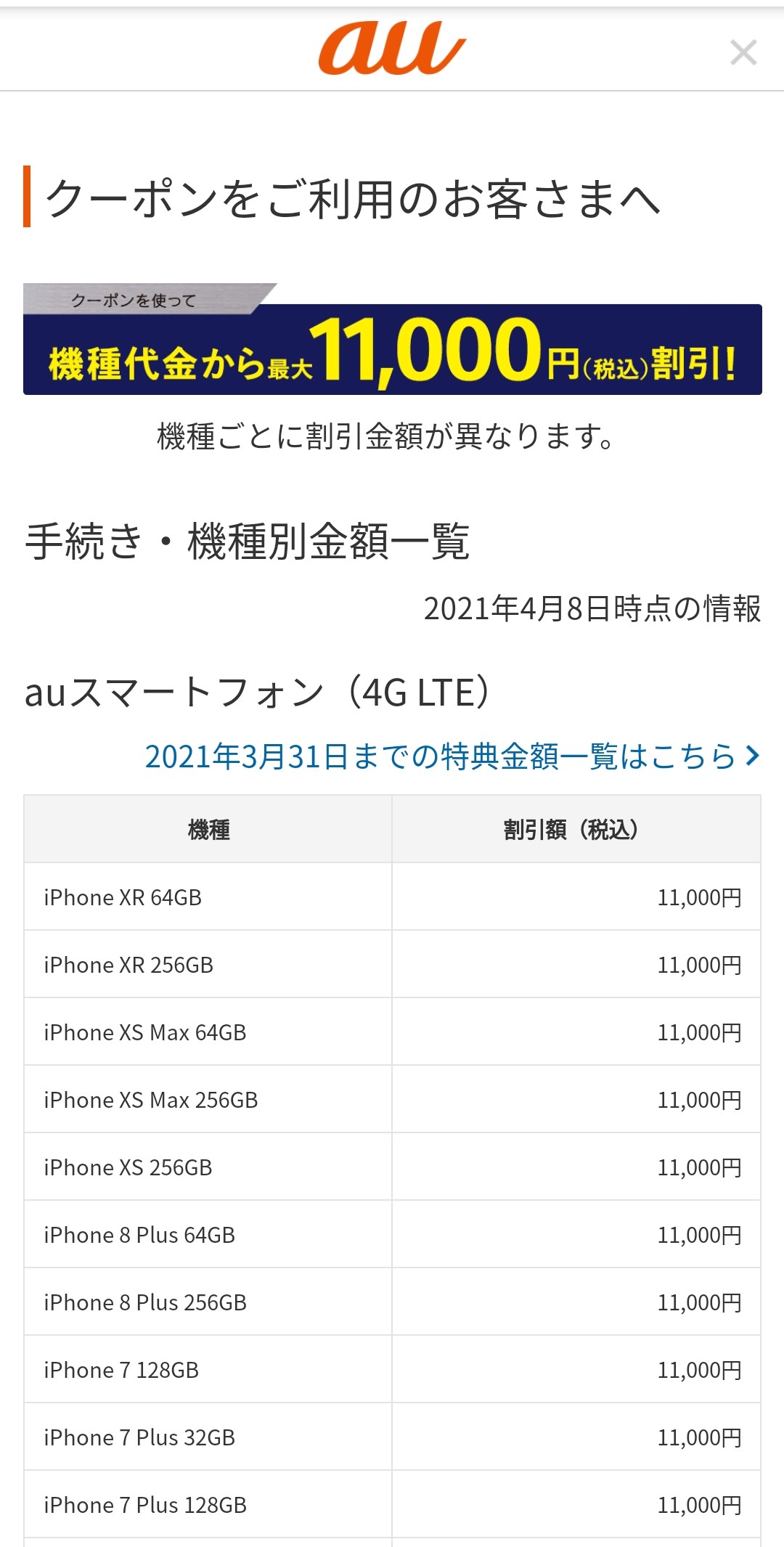 2021年4月もauの機種変更で利用出来る、MNP引き止めポイント(コジポ・スペシャルクーポン)が配布されています。最大11,000円割引です。対象機種については下記ご参照下さい。