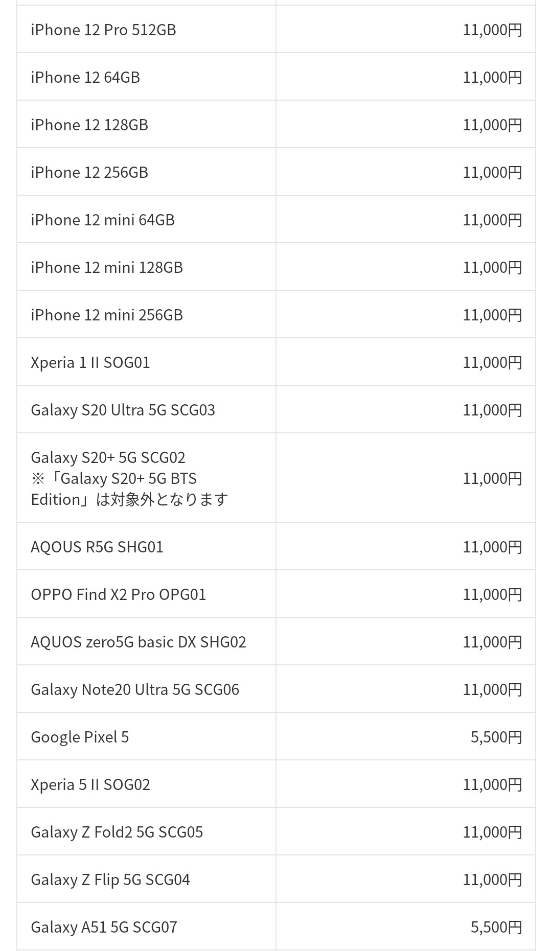 ちなみに、「TORQUE 5G KYG01」や「Galaxy S21」は5G機種変更おトク割の対象となっていますので、指定プラン加入や故障紛失サポート(有料)加入などの要件を満たせば、さらに5,500円割引(若しくはキャッシュバック)となります。