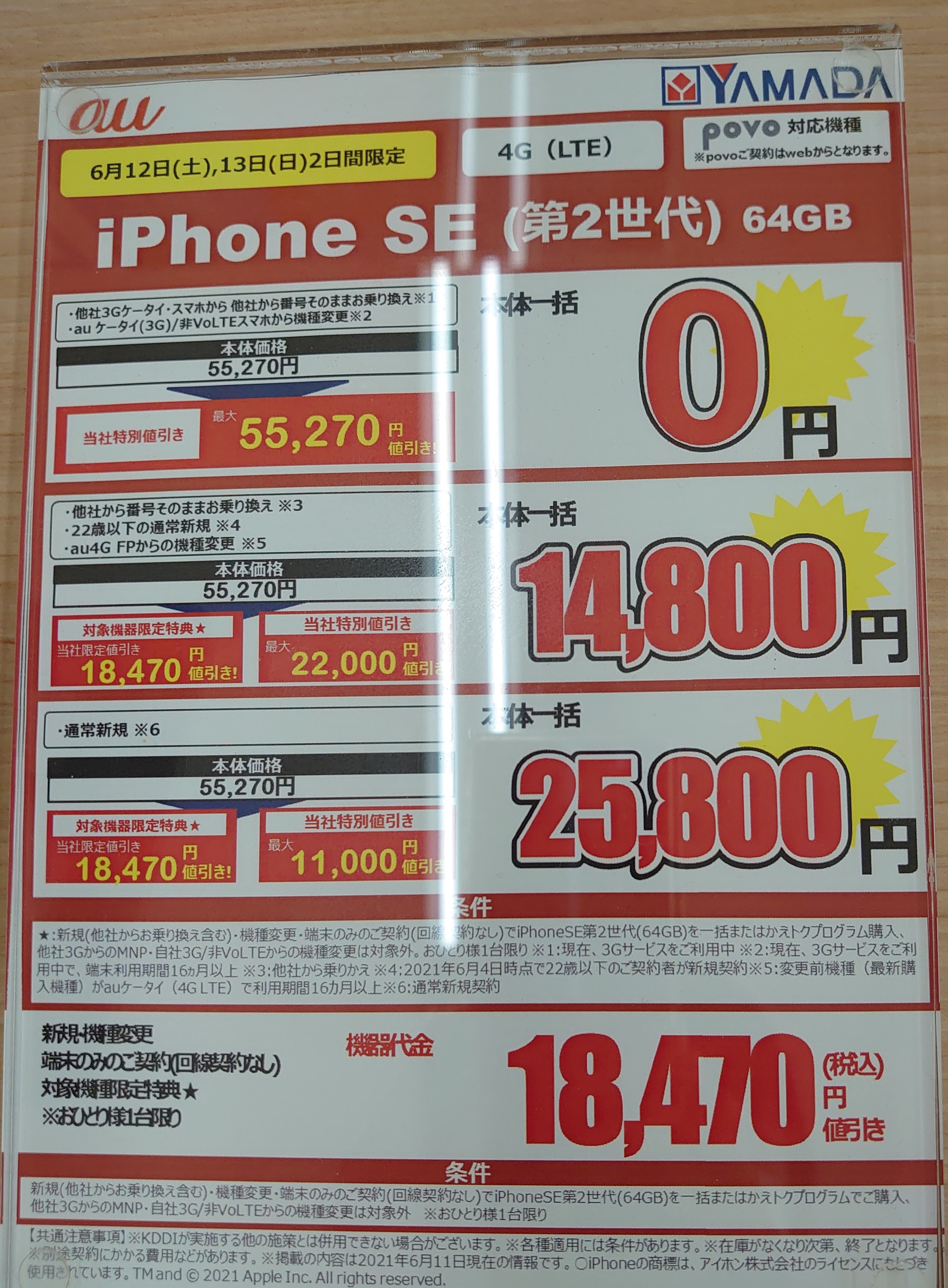 ヤマダ電機のauでは、iPhone SE(第2世代)64GB(税込55,270円)が、MNPで一括14,800円(税込)です。残すは6月13日(日)のみ、お急ぎ下さい。即povoへ移行でもいいでしょう。