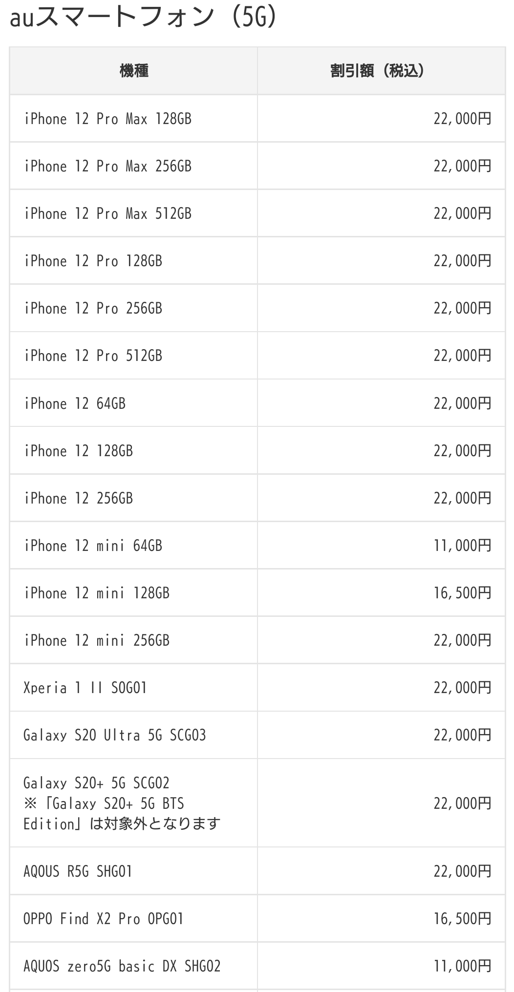 au iPhone 12シリーズなどが機種変更で最大22,000円割引になります。miniは単体価格自体の値下げがありましたので、割引額も少なめです。