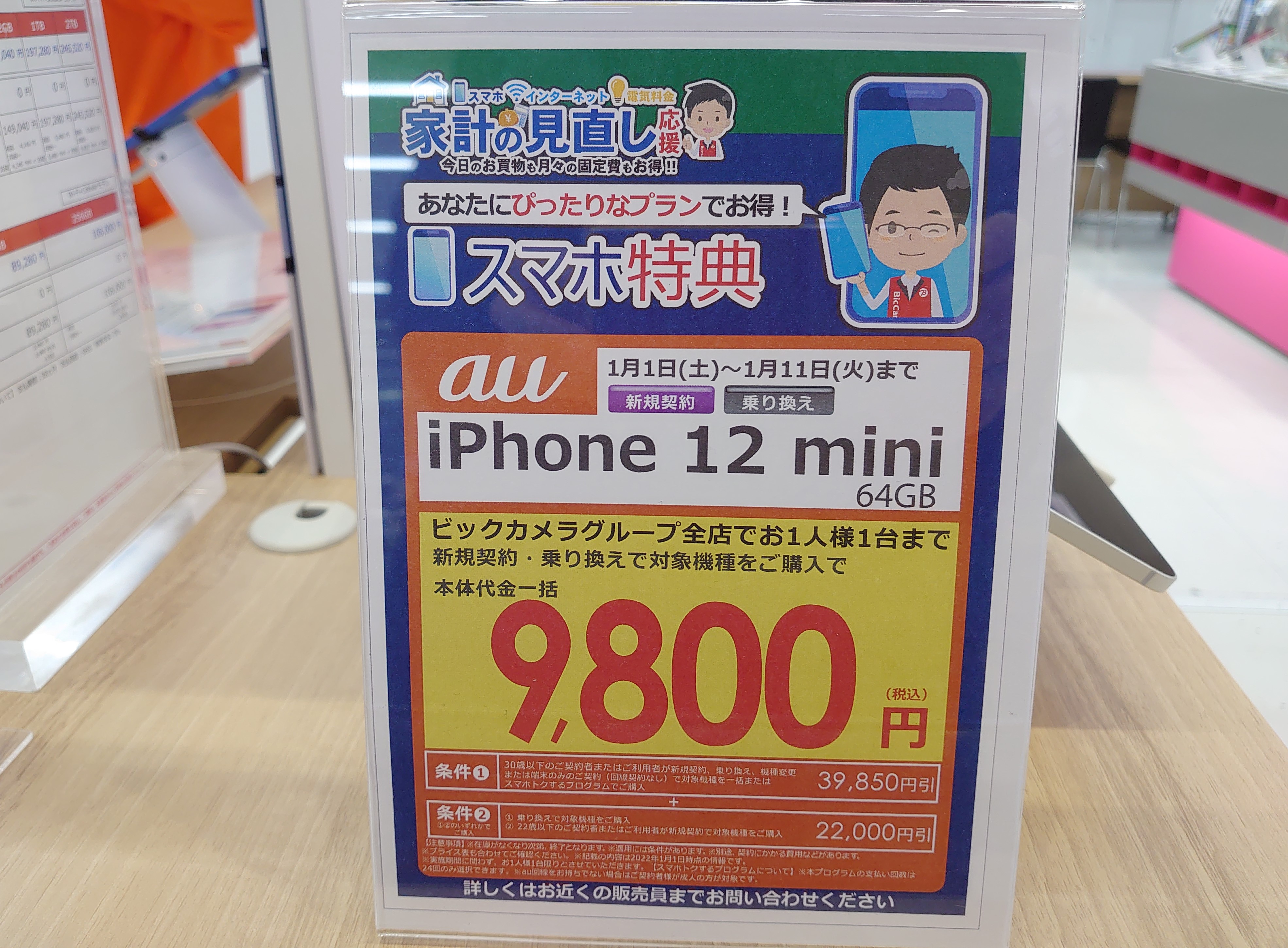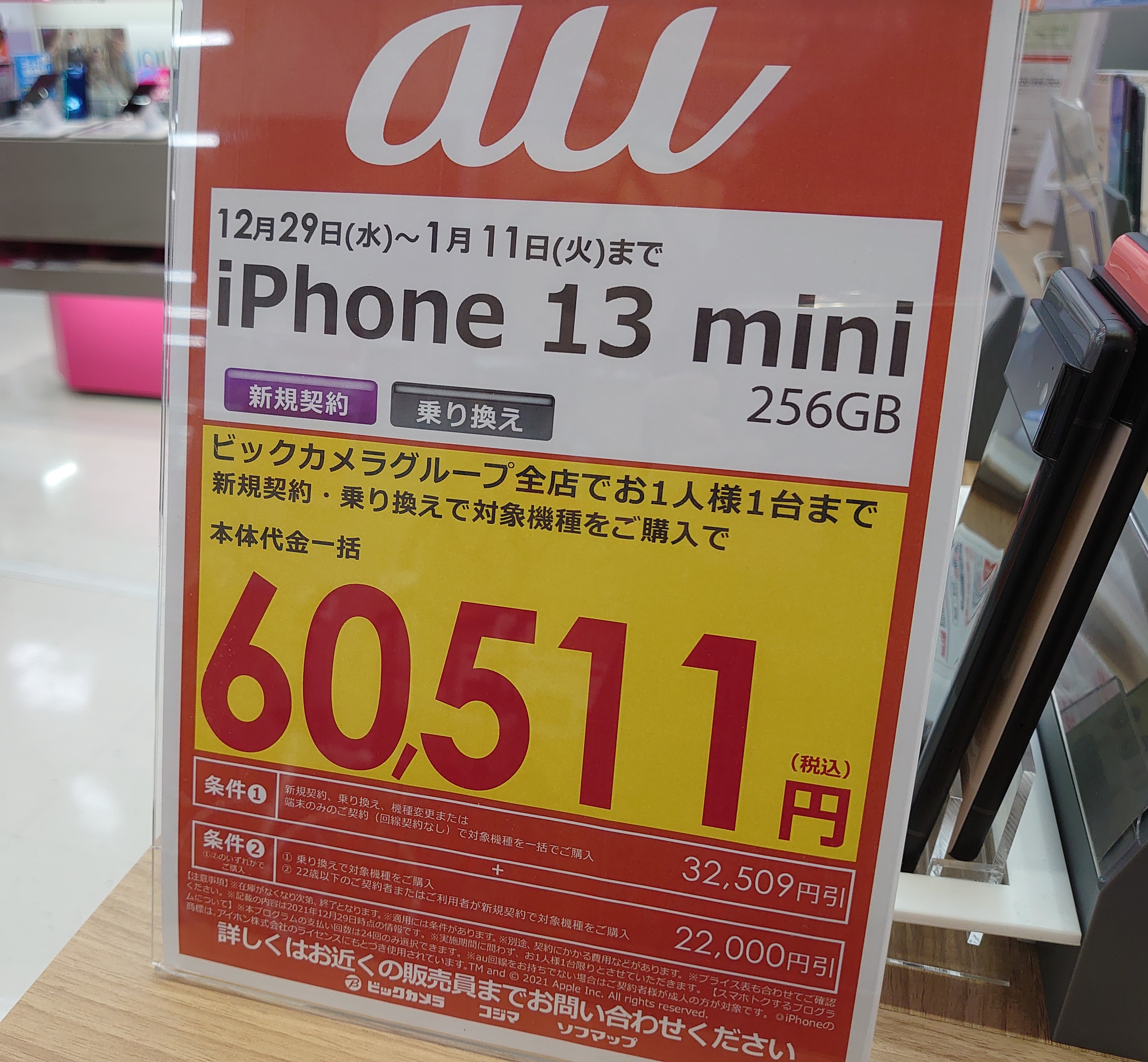 上記ポップはビックカメラで撮影したもので、「iPhone 12 mini 128GB(税込77,125円)」が一括15,275円(税込)というのは、「30歳以下のMNP」若しくは「22歳以下の新規」という条件が付くのですが、例によってau機種変更スペシャルクーポン取得で、これに近い価格で機種変更も可能です。