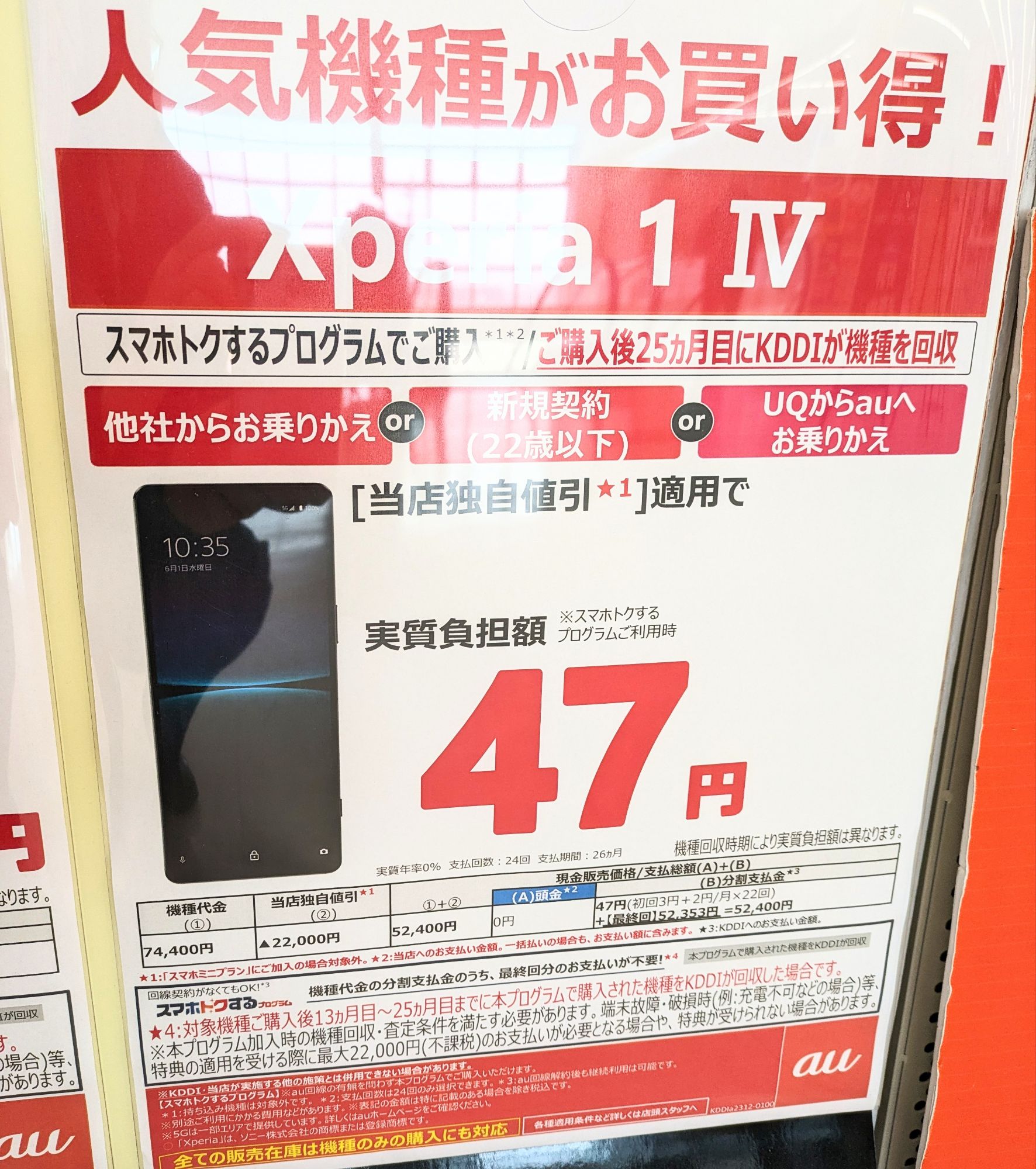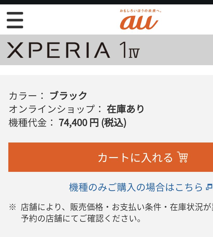 2022年6月発売の、au「Xperia 1 IV SOG06」の本体価格が74,400円(税込)に値下げされました。