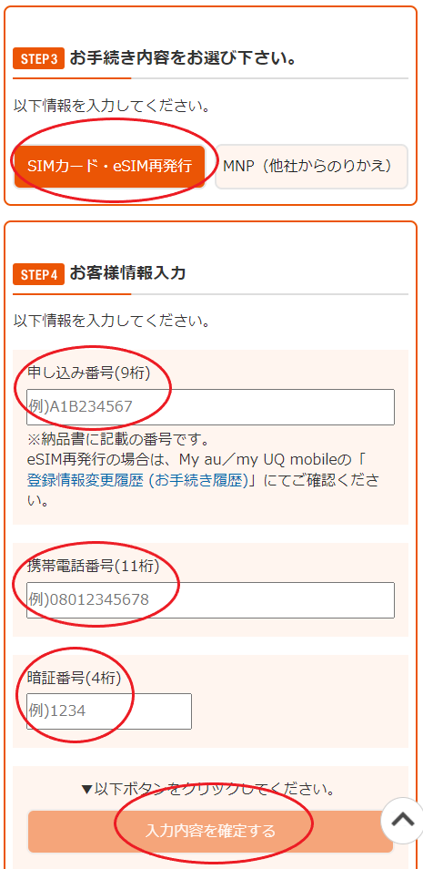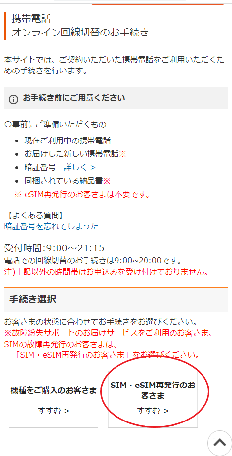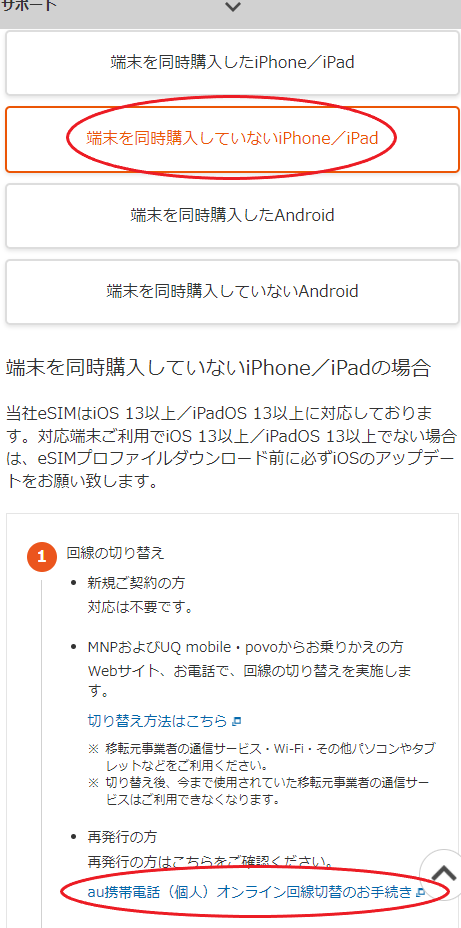 「端末を同時購入していないiPhone」→「回線切り替えのお手続き」→「eSIM再発行のお客様」→「STEP1~4」で進んでいきます。