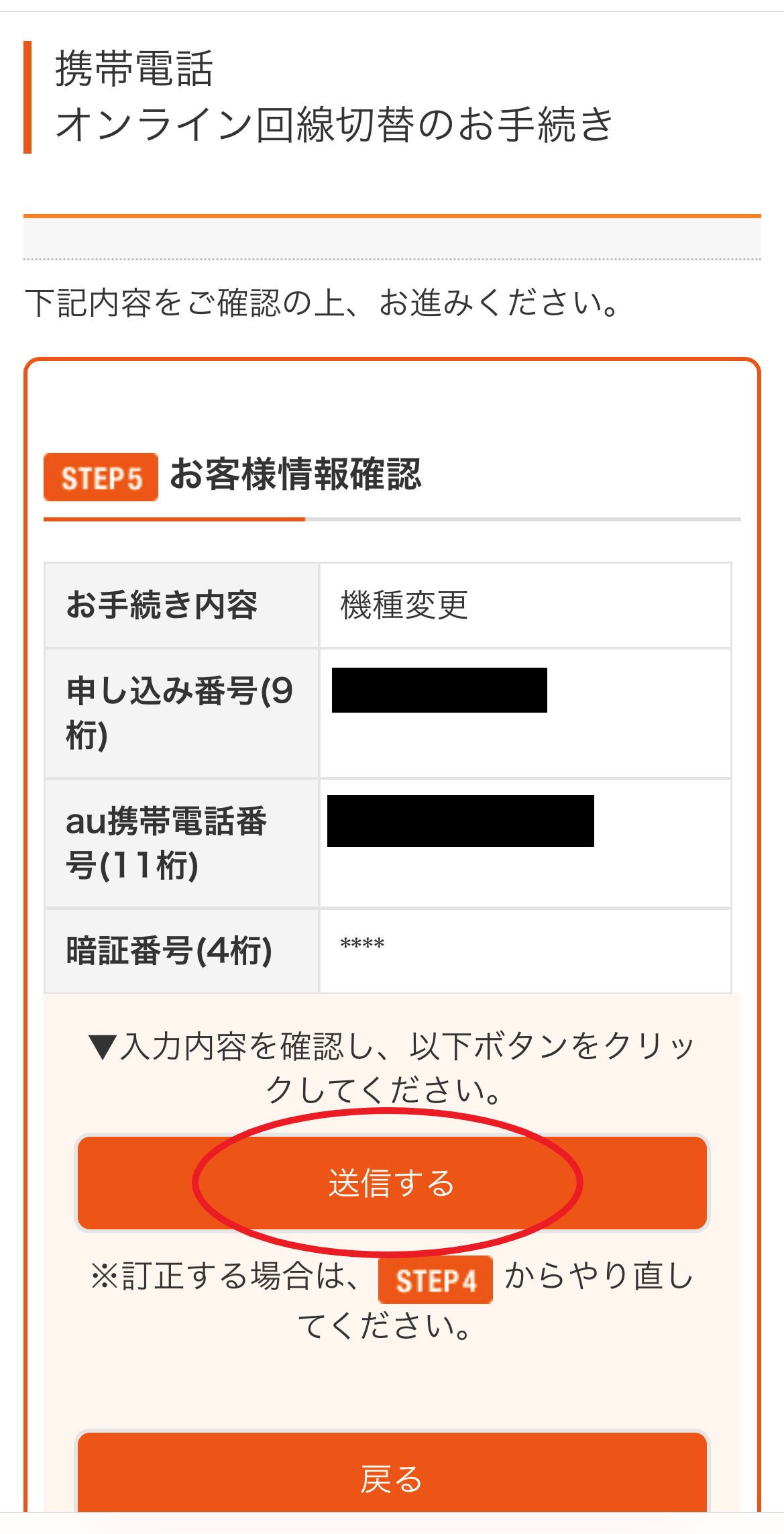 前ページで取得した「申込番号」を入力して、実際にeSIM機種変更を申し込む作業です。私はMyauにログインしておいた(新)iPhoneでこの作業を行いましたが、引き続き(旧)iPhoneの方でしても問題ないかと思います。