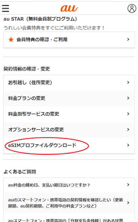 「My au TOP」で少し下にスクロールしていくと「eSIMプロファイルダウンロード」という項目があります。