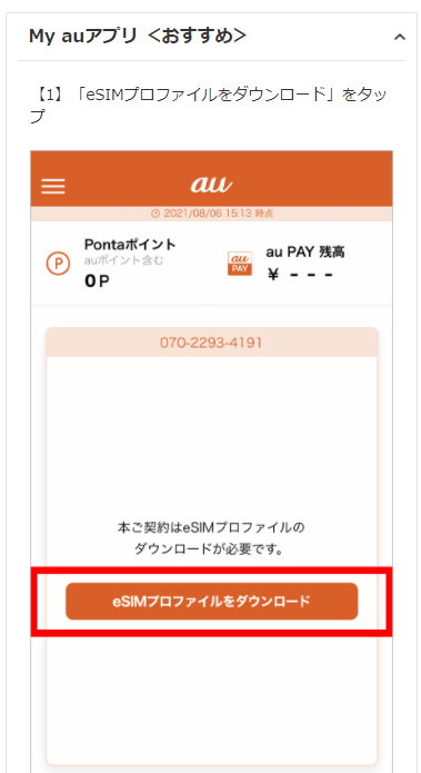 「au eSIM開通お手続き → 端末を同時購入していないiPhone → eSIMプロファイルダウンロード」より
