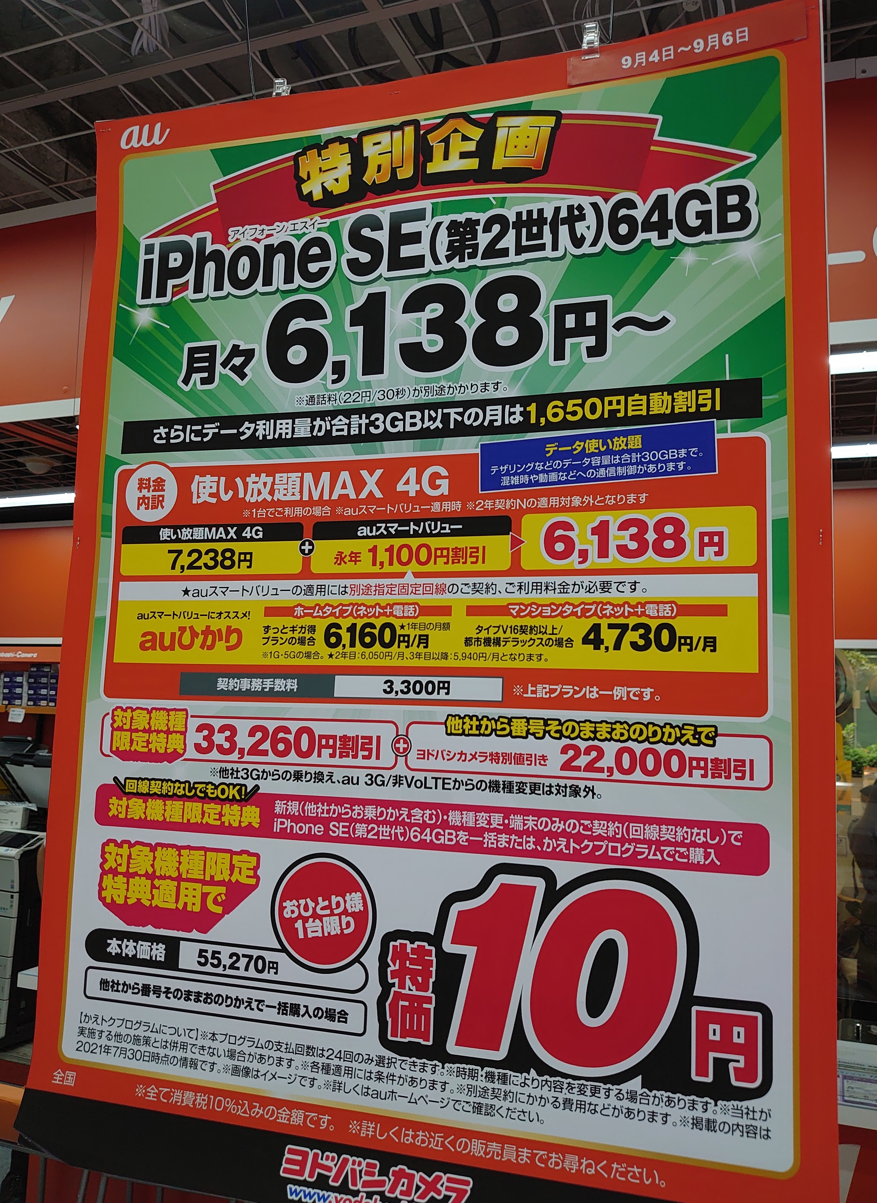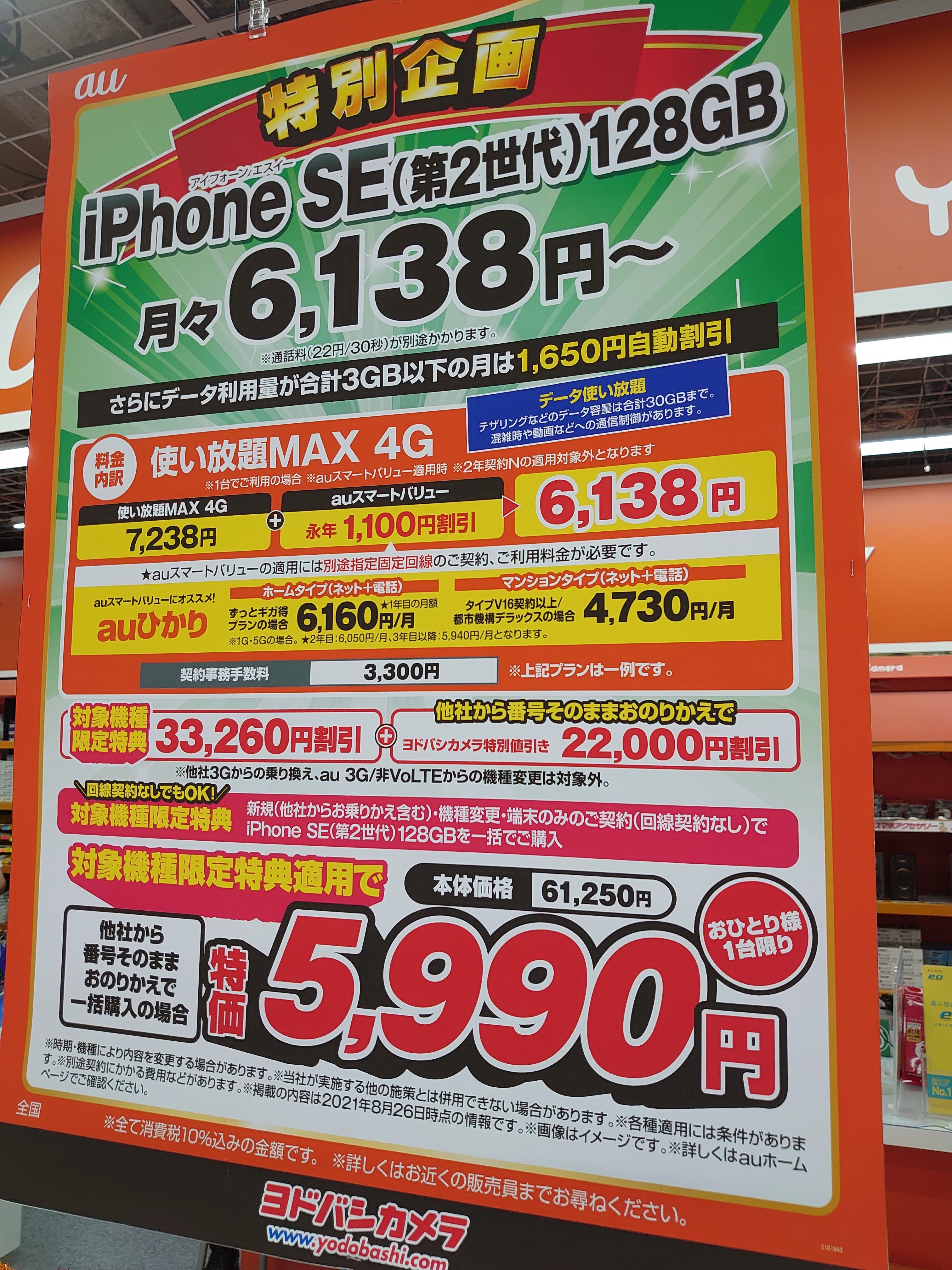 【9/4~9/6】au iPhone SE 64GBがMNP一括10円/ヨドバシカメラ梅田 2021 9/05 au 2021年9月5日 当ページにはアフィリエイト広告が含まれています。 9/6(月)迄です。 au よかったらシェアしてね! URLをコピーしました! URLをコピーしました! この記事を書いた人 Sakura R5G ケータイ特価情報をお届けします。 遠慮なくコメント頂ければ結構ですが、コメントは私が承認するまで表示されませんので、ご注意下さい。 ※2024年7月1日より、参考程度の投稿以外はX(旧ツイッター)に投稿しようと思っています。 人気記事 ワイモバイル 【8/14(木)より】価格(再)更新、ワイモバイル「Google Pixel 8a」が機種変更で49,536円にPayPay還元/事務手数料0円/ヤフーショッピング店 2025年8月14日 ワイモバイル 【2025/11版】ワイモバイル「iPhone 13(認定中古品)」が機種変更一括29,520円/事務手数料3,850円/オンラインストア 2025年11月9日 楽天モバイル 【2025/12版】楽天モバイル「nubia S2R」や「Galaxy A25 5G」がMNP一括1円/事務手数料0円 2025年12月2日 ドコモ 【2025/8版】ahamoへのSIMのみMNPで20,000dポイント(分割進呈)/事務手数料0円/NTTドコモ 2025年8月10日 楽天モバイル 【7/1(火)より】楽天モバイルへのMNPで▲22,000円割引/「Nothing Phone (3a)」が一括32,890円など/事務手数料0円 2025年7月1日 新着記事 【1/10(土)】 Joshin webで「Xiaomi 14T Pro 512GB(パッケージ不良)」が79,800円 【1/15(木)発売】楽天モバイル「Nothing Phone (3a) Lite」が32,890円/はじめて申し込み&MNPで16,000ポイント/2回線目以降は新規で6,000ポイント 【1/13(火)まで】UQモバイル「自宅セット割」適用で10,000ポイント追加還元/ビックカメラ コメント コメントする コメントをキャンセルコメント ※ 名前 メール サイト 新しいコメントをメールで通知 新しい投稿をメールで受け取る