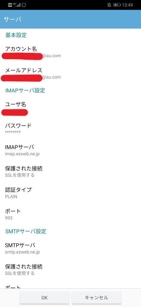 ・SMTPサーバとIMAPサーバがそれぞれ「smtp02.au.com」「imap02.au.com」になっていた。(設定情報に記載されている)