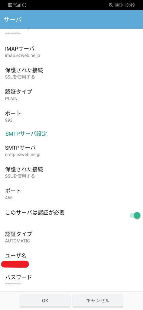 ・ユーザー名にメールアドレスのアカウント名が初めから入っているが、設定情報のユーザー名に書き換える。(2箇所)