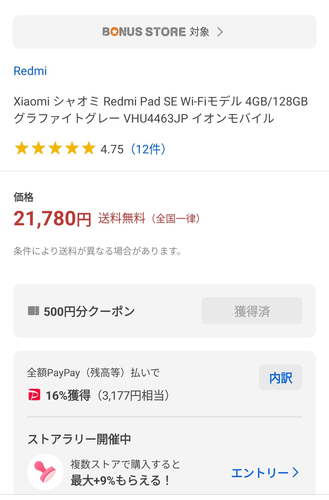 2024年4月14日(日)、イオンモバイルオンラインショップでは、2023年9月発売のXiaomi「Redmi Pad SE Wi-Fiモデル(4GB/128GB)」が、21,780円(税込)に約3,177円相当のPayPayポイント還元となっています。