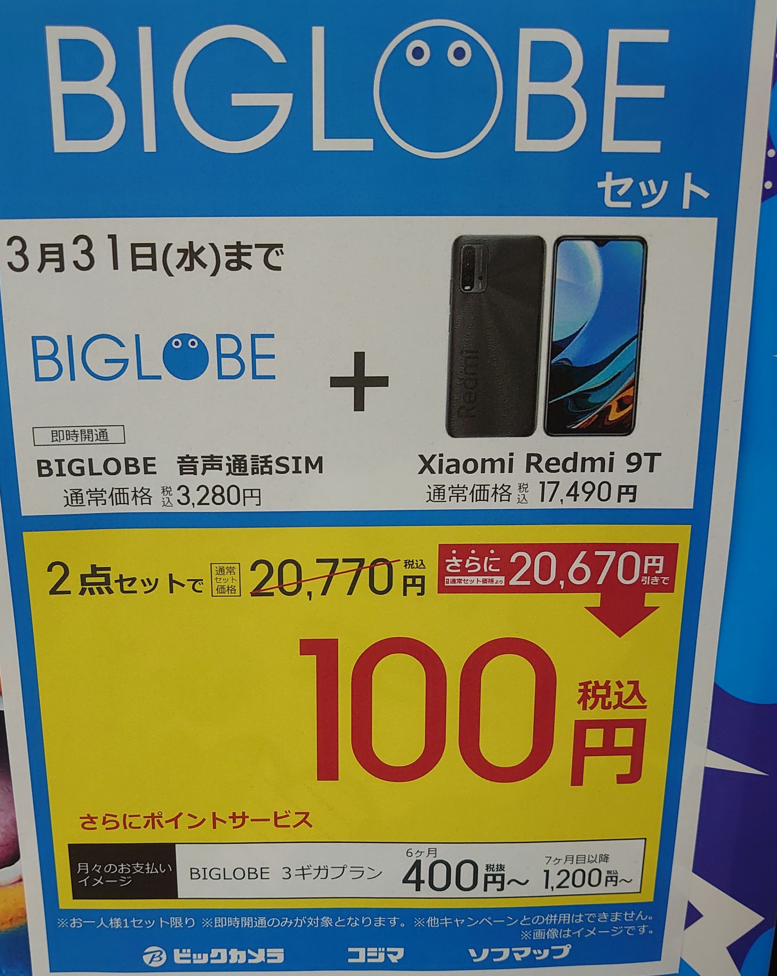 ビックカメラでは、2021年2月5日発売の「Xiaomi Redmi 9T」がビッグローブとのSIMセット(新規・MNP)で一括100円(税込)です。BIC SIM(IIJ mio)も同じく一括100円です。