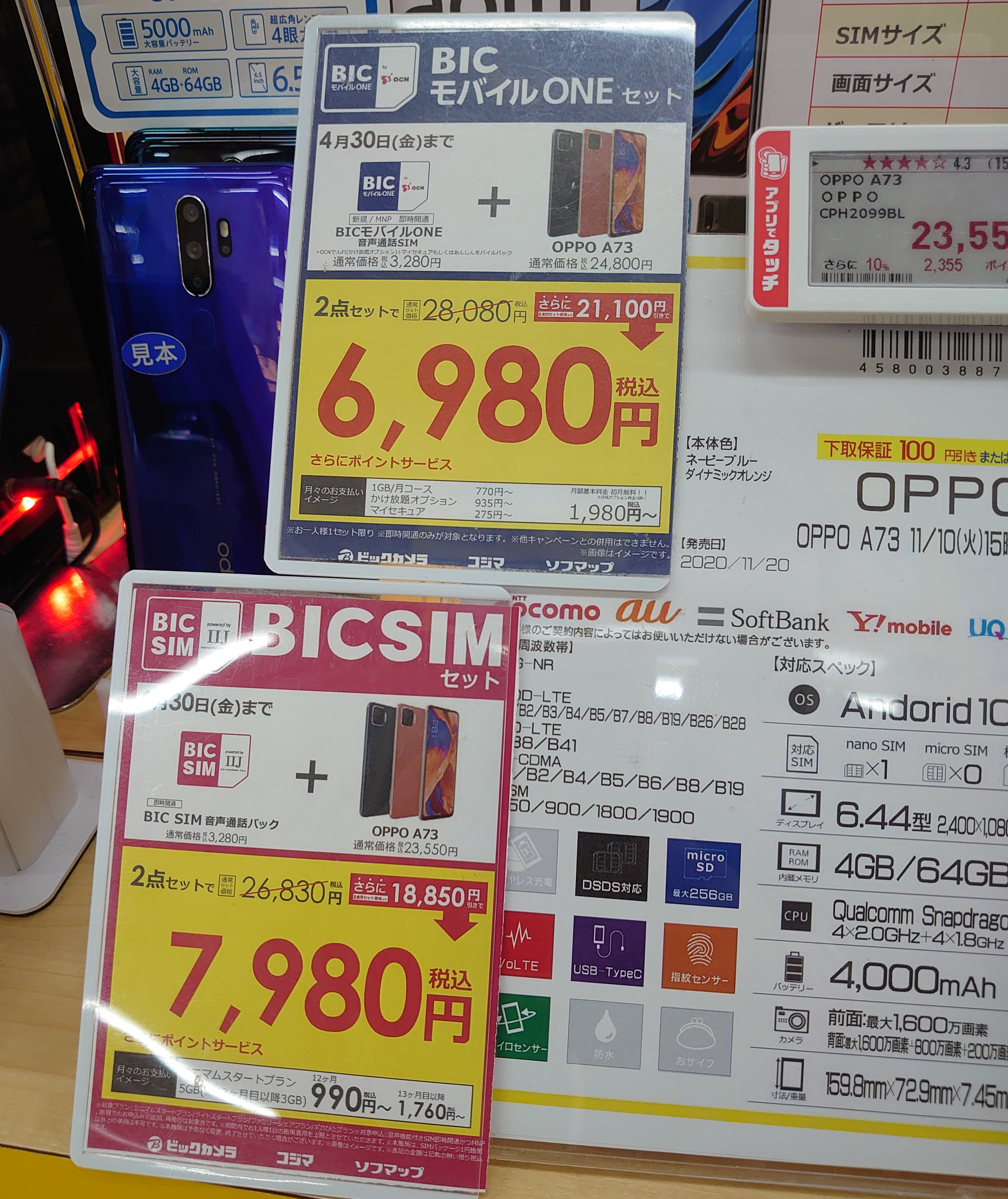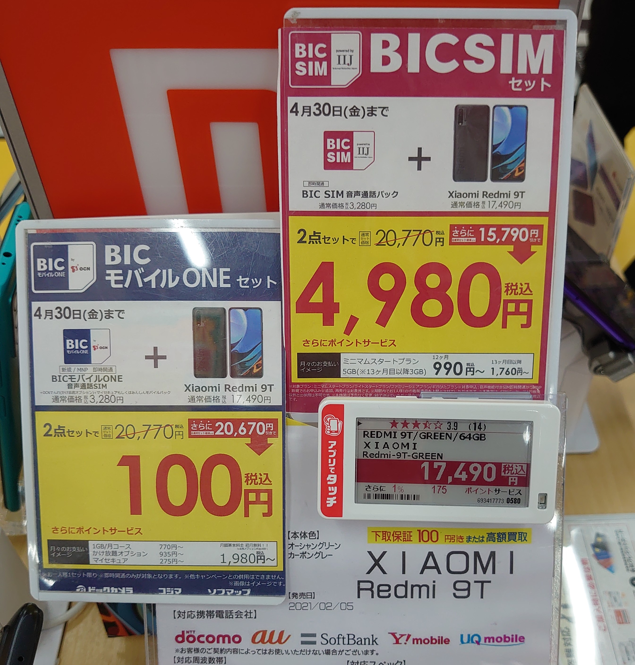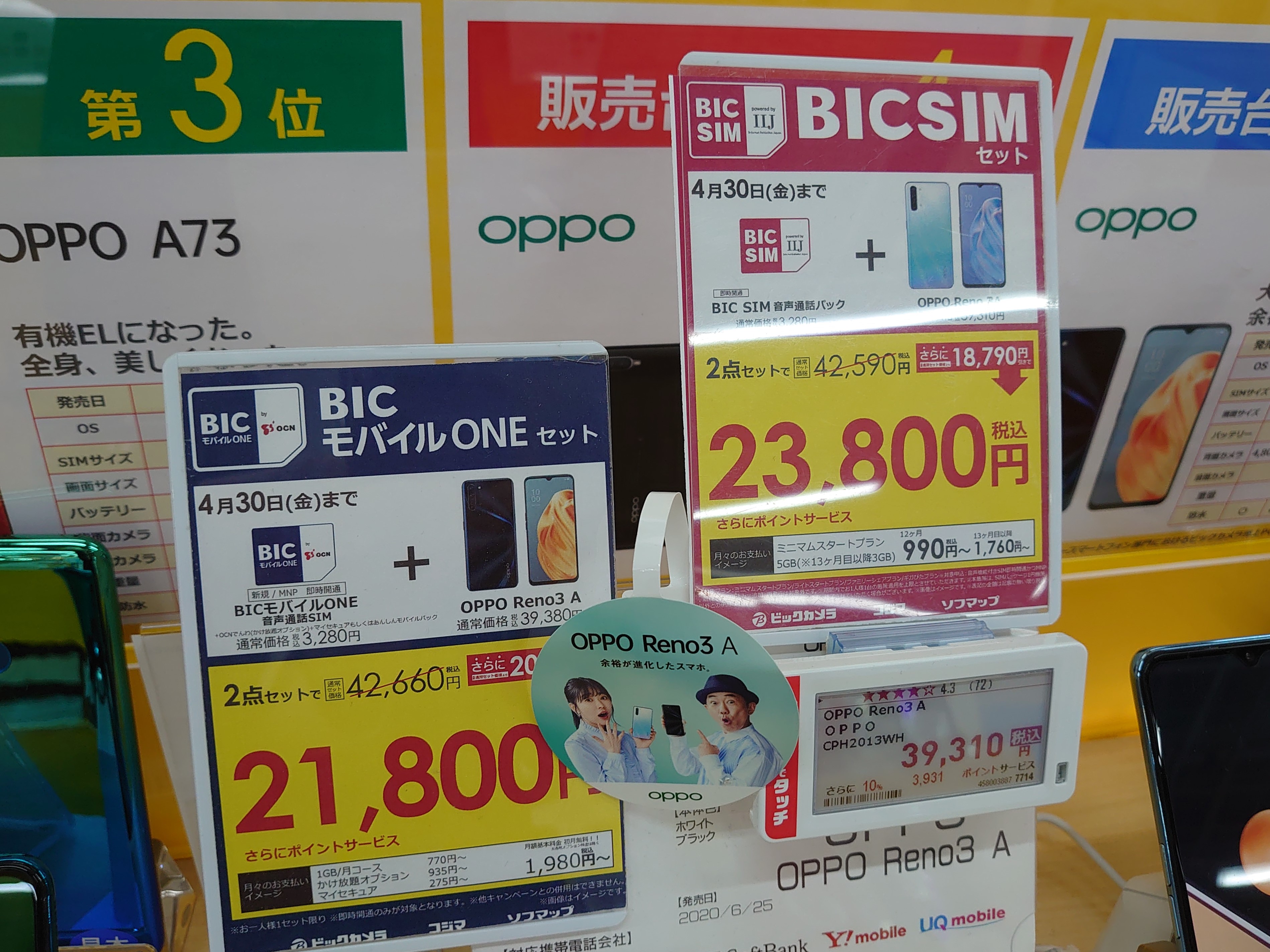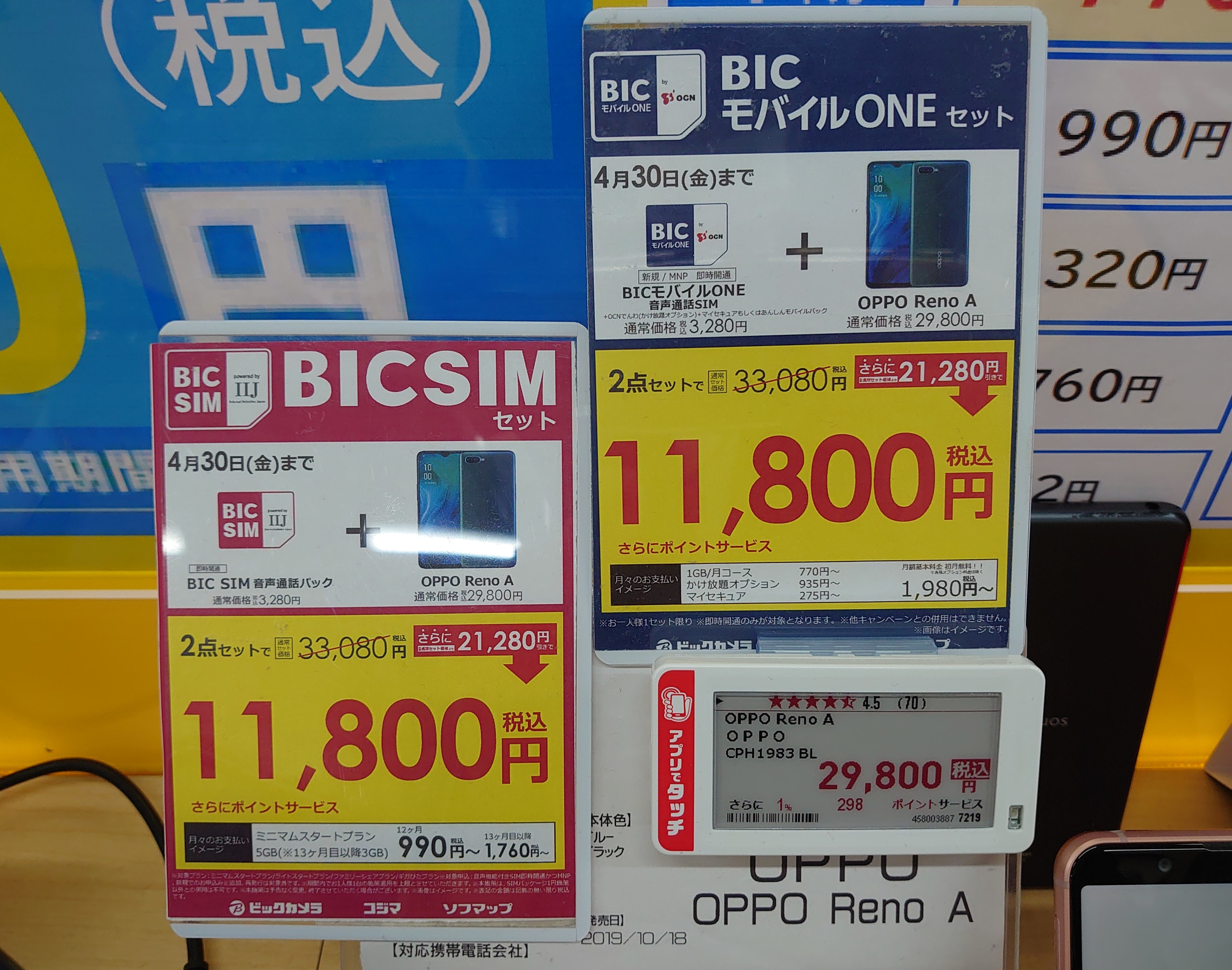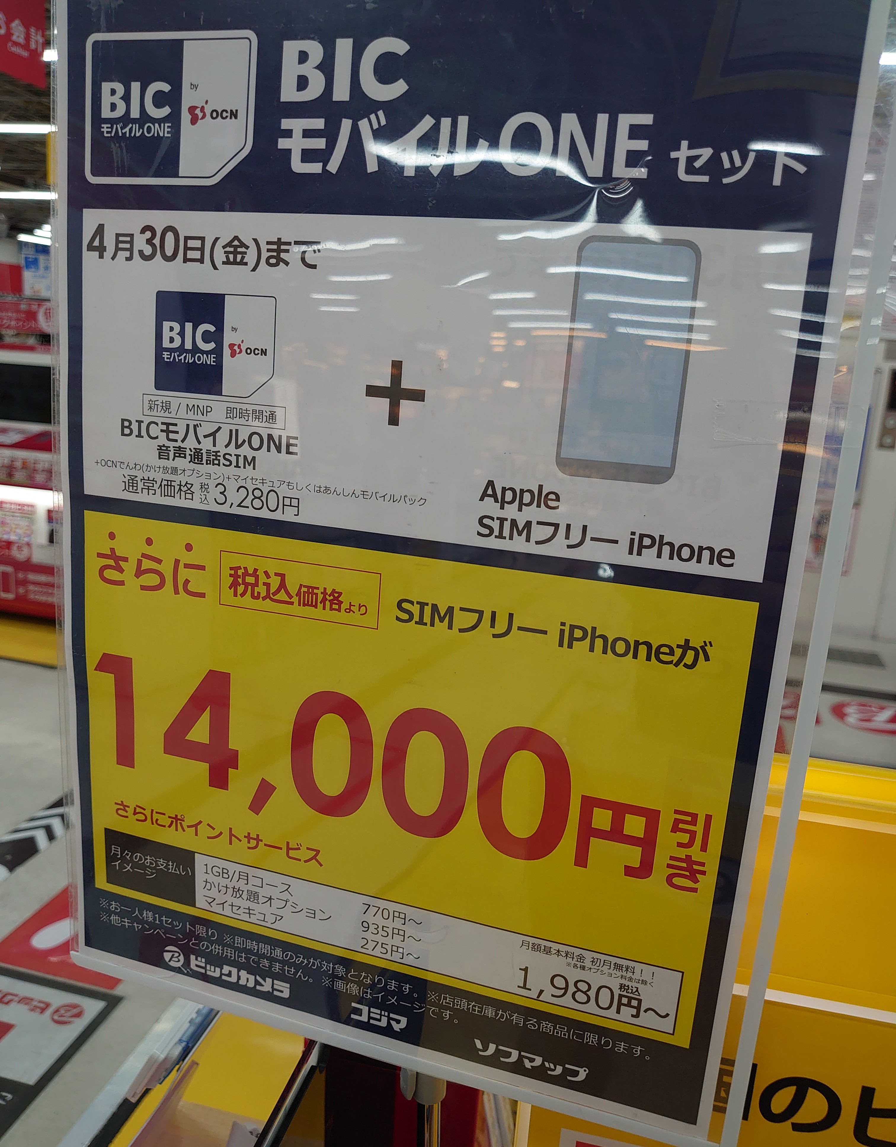 BICSIM(IIJmio)、BICモバイルONEともに事務手数料込みの価格です。4月30日(金)まで。