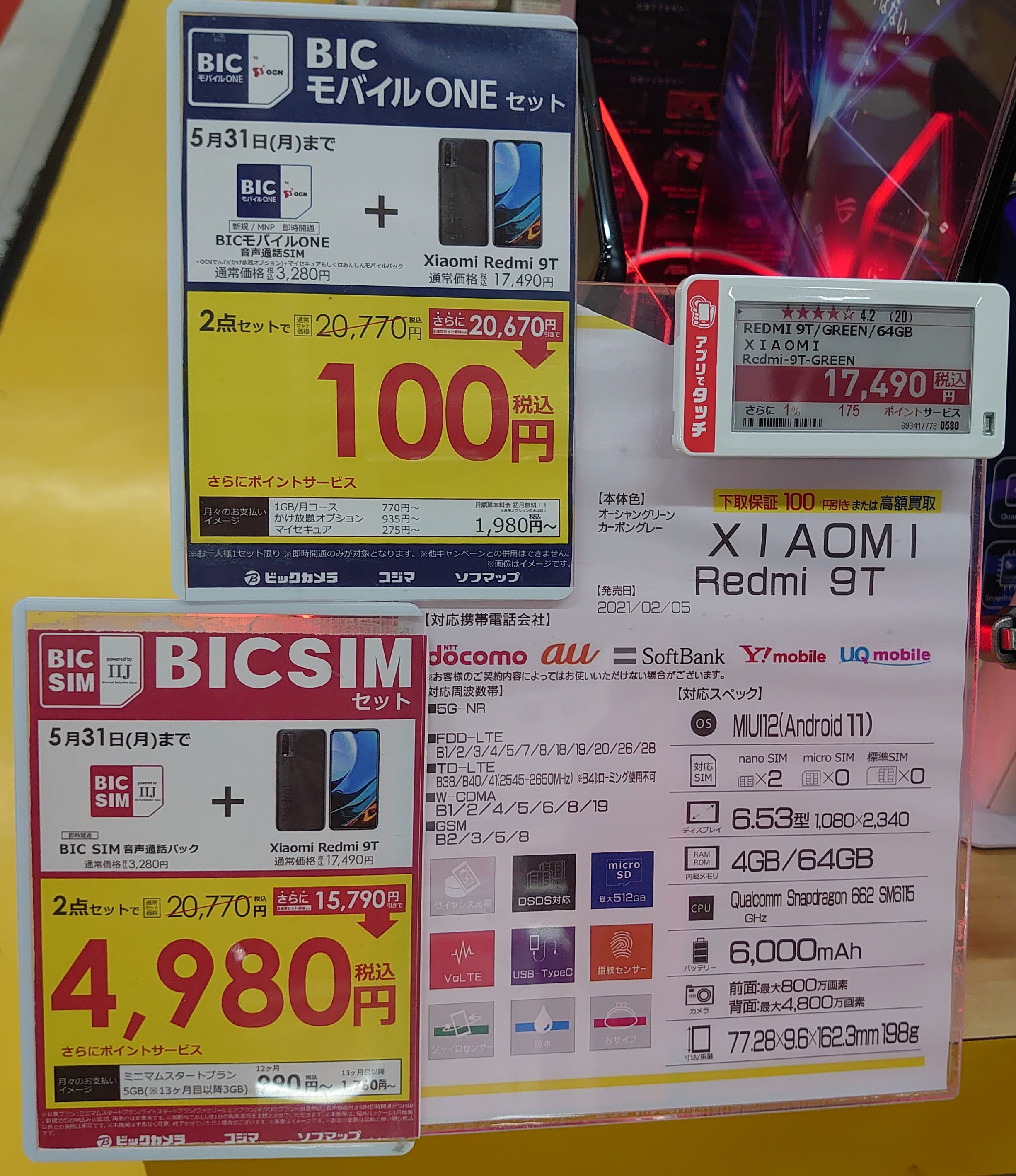 Xiaomi Redmi 9TがOCN契約(事務手数料込)で100円ですので、若干おトクなのかなと思います。