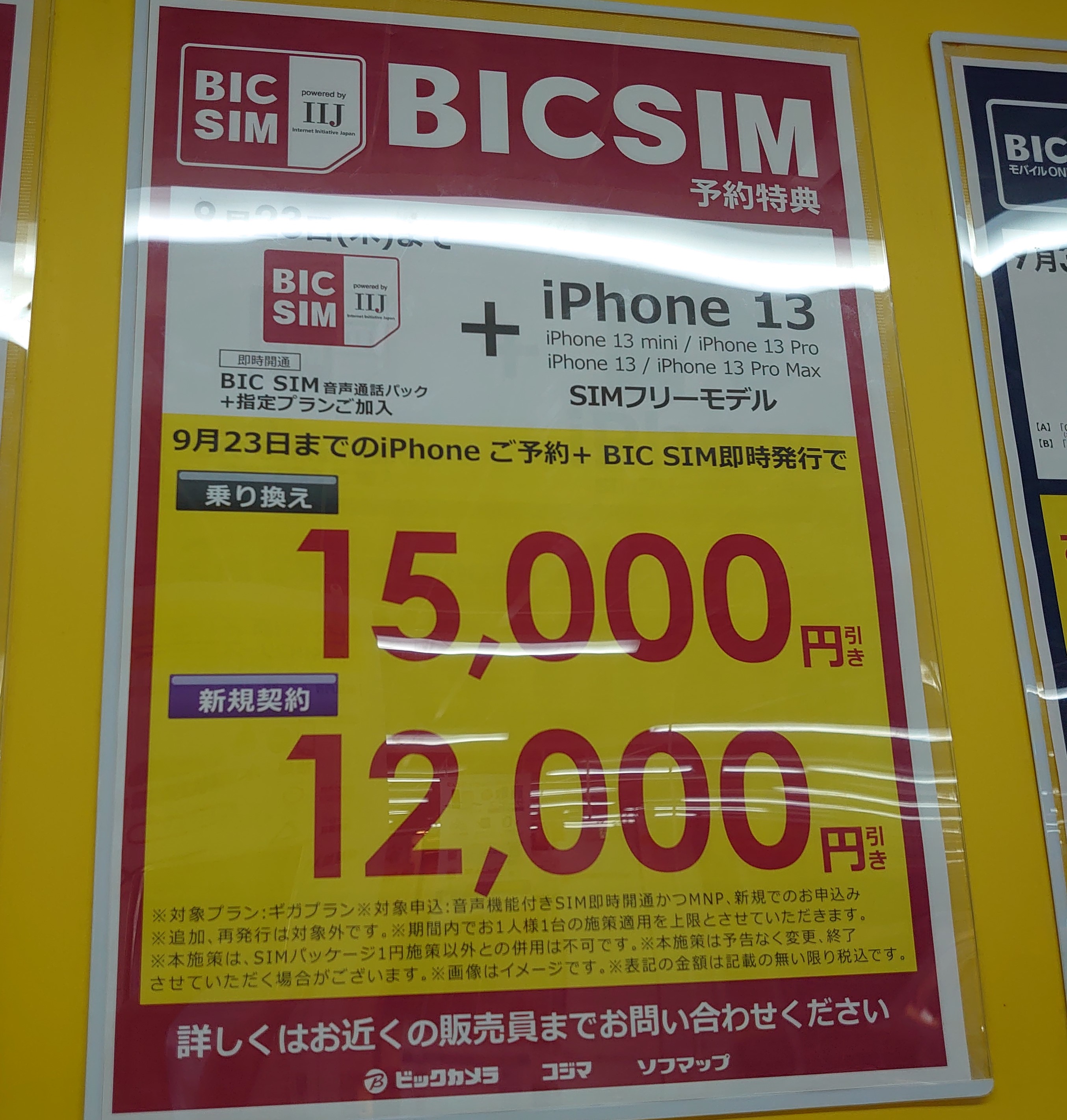 【予約】BIC SIMへのMNPでiPhone 13が15,000円割引/SIMフリー 2021 9/18 SIMフリー 2021年9月18日 当ページにはアフィリエイト広告が含まれています。 MNPで15,000円割引、新規で12,000円割引です。 通常は13,000円/10,000円割引です。iPhone13発売後にこの通常割引額が増えるという可能性もありますが、今のところは何とも言えません。当然減る可能性もあります。 SIMフリー よかったらシェアしてね! URLをコピーしました! URLをコピーしました! この記事を書いた人 Sakura R5G ケータイ特価情報をお届けします。 遠慮なくコメント頂ければ結構ですが、コメントは私が承認するまで表示されませんので、ご注意下さい。 ※2024年7月1日より、参考程度の投稿以外はX(旧ツイッター)に投稿しようと思っています。 人気記事 ワイモバイル 【8/14(木)より】価格(再)更新、ワイモバイル「Google Pixel 8a」が機種変更で49,536円にPayPay還元/事務手数料0円/ヤフーショッピング店 2025年8月14日 ワイモバイル 【2025/11版】ワイモバイル「iPhone 13(認定中古品)」が機種変更一括29,520円/事務手数料3,850円/オンラインストア 2025年11月9日 楽天モバイル 【2025/12版】楽天モバイル「nubia S2R」や「Galaxy A25 5G」がMNP一括1円/事務手数料0円 2025年12月2日 ドコモ 【2025/8版】ahamoへのSIMのみMNPで20,000dポイント(分割進呈)/事務手数料0円/NTTドコモ 2025年8月10日 楽天モバイル 【7/1(火)より】楽天モバイルへのMNPで▲22,000円割引/「Nothing Phone (3a)」が一括32,890円など/事務手数料0円 2025年7月1日 新着記事 【1/10(土)】 Joshin webで「Xiaomi 14T Pro 512GB(パッケージ不良)」が79,800円 【1/15(木)発売】楽天モバイル「Nothing Phone (3a) Lite」が32,890円/はじめて申し込み&MNPで16,000ポイント/2回線目以降は新規で6,000ポイント 【1/13(火)まで】UQモバイル「自宅セット割」適用で10,000ポイント追加還元/ビックカメラ コメント コメントする コメントをキャンセルコメント ※ 名前 メール サイト 新しいコメントをメールで通知 新しい投稿をメールで受け取る