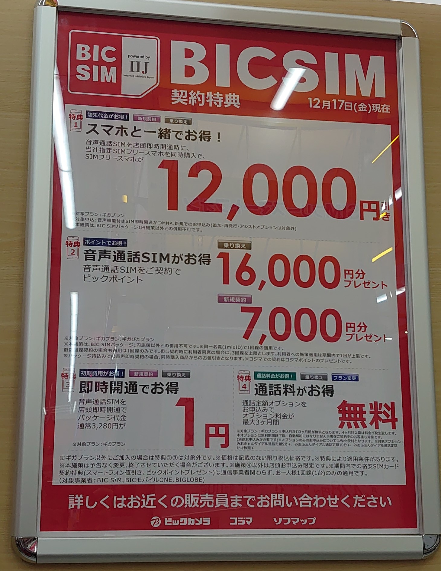 ビックカメラではIIJmioこと「BIC SIM」へのMNPで16,000ポイント還元となっています。年末ということで通常7,000ポイントからの大幅増です。事務手数料は1円。