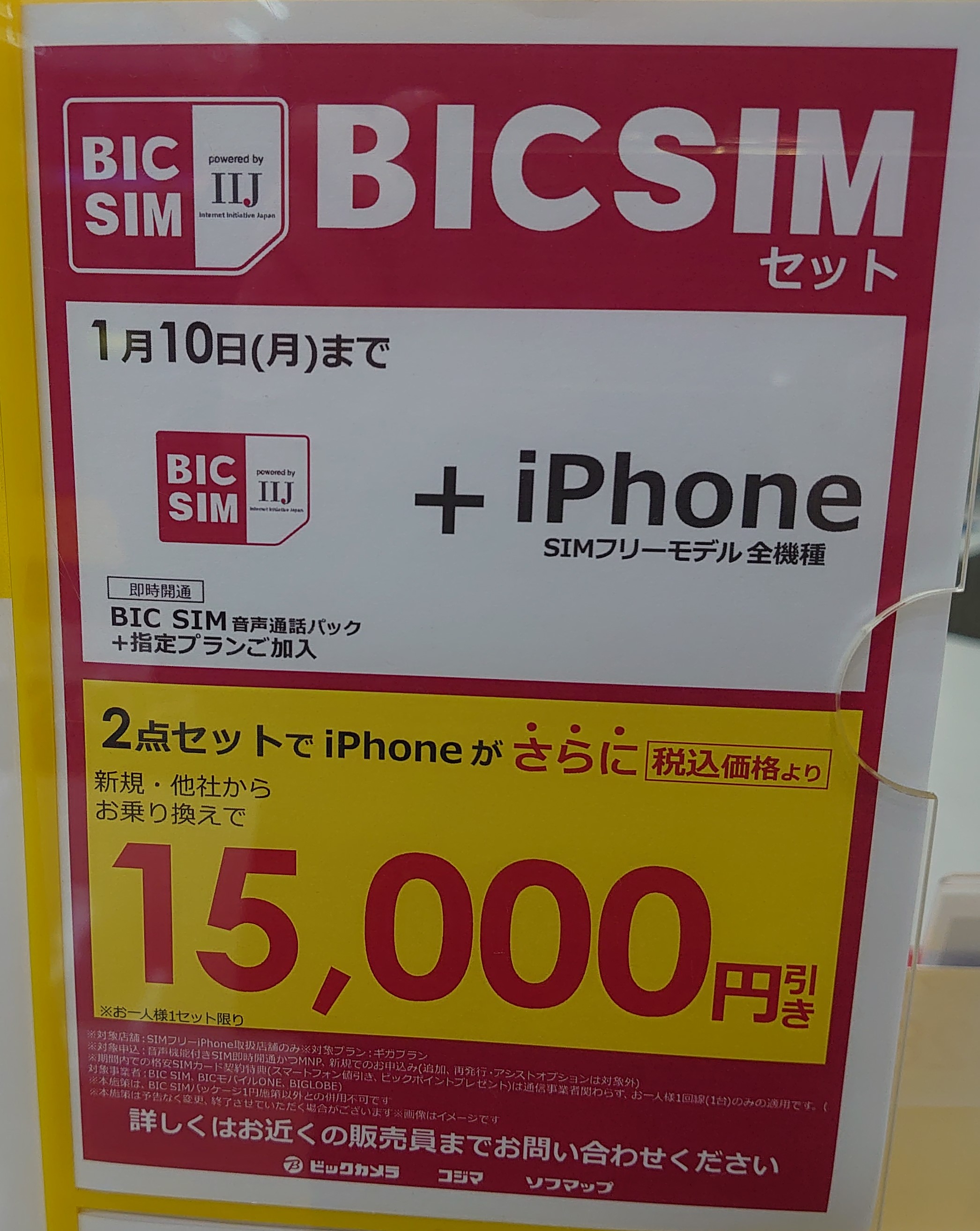 また、新規若しくはMNPでSIMフリーiPhoneが15,000円割引です。事務手数料込。1月10日(月)まで。