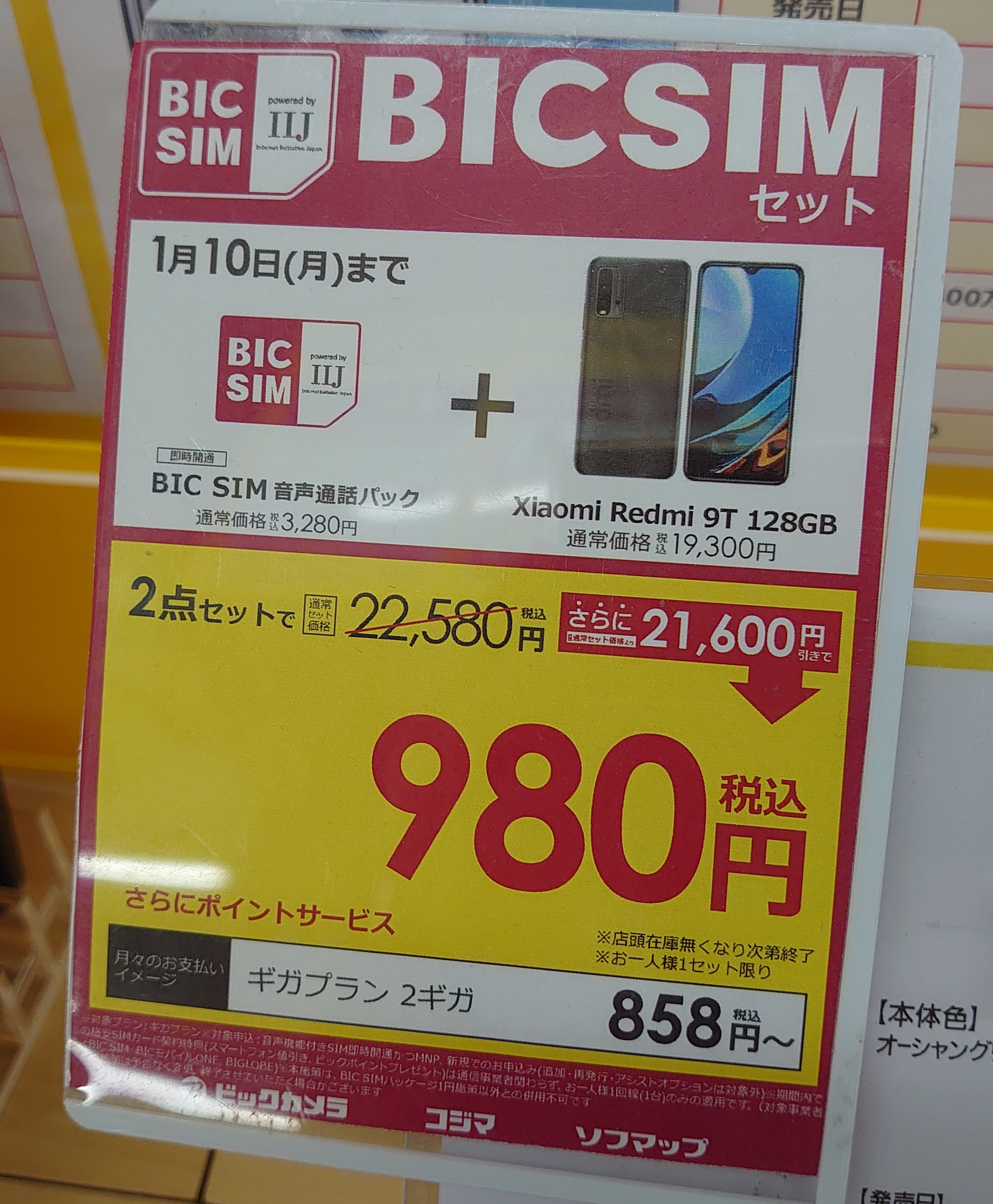 ビックカメラでは「Xiaomi Redmi 9T 128GB」が、BIC SIM(IIJmio)契約で980円(税込)と大変お買い得になっています。1月10日(月)まで。