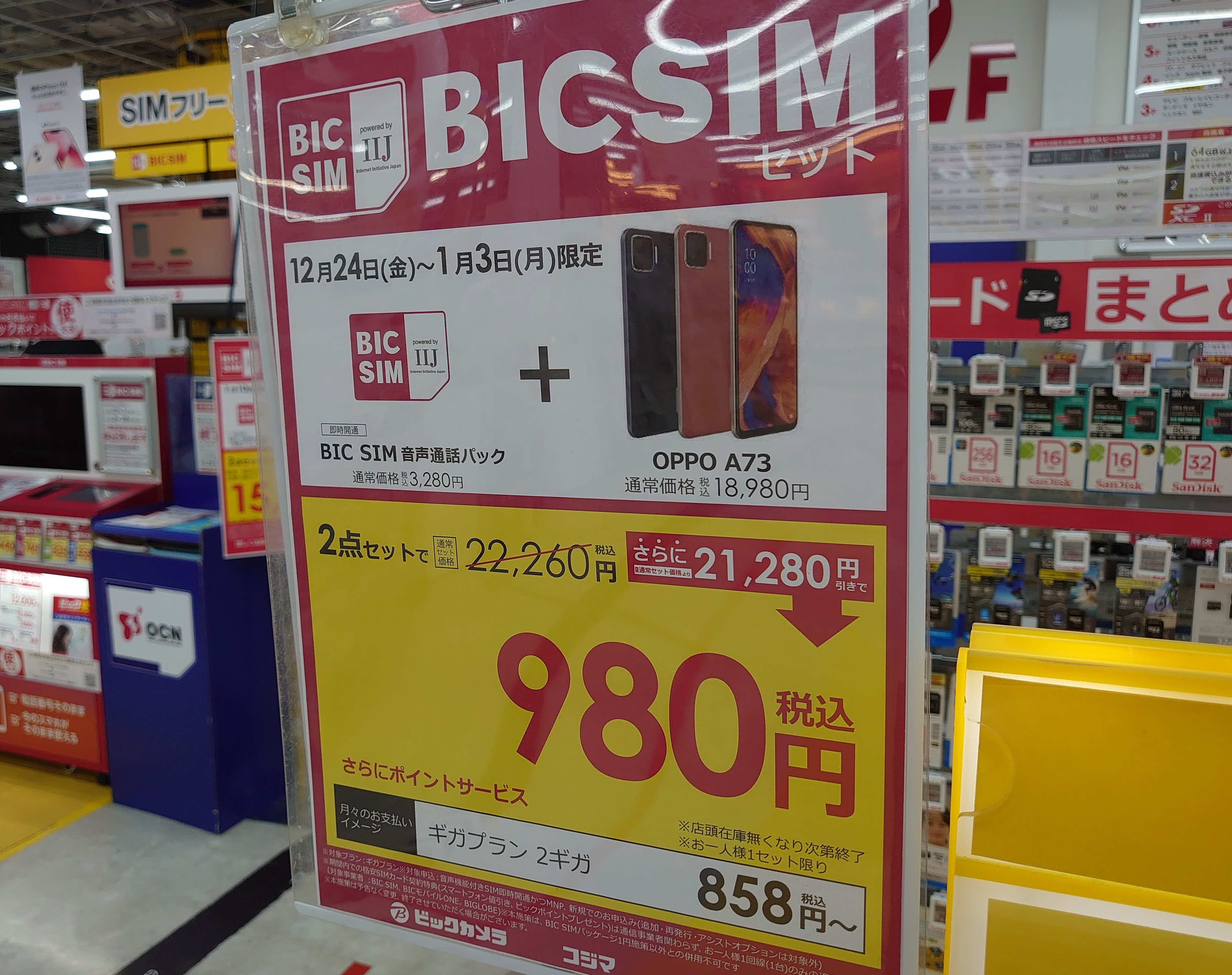 また、「OPPO A73」も同じく980円(税込)です。こちらは1月3日(月)まで。