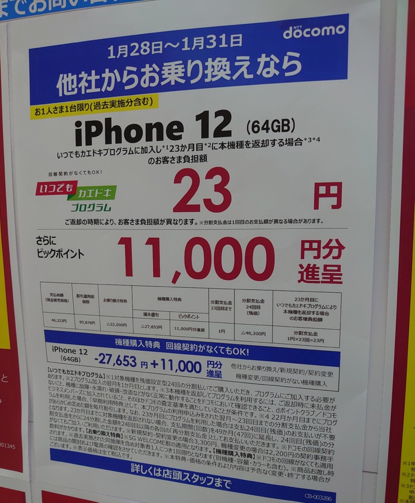 【1/末】ドコモ「iPhone 12 64GB」がMNP一括46,223円+11,000P/ビックカメラ 2022 1/29 ドコモ 2022年1月29日 当ページにはアフィリエイト広告が含まれています。 先週はポイントを充てて一括35,223円(税込)という報告をしましたが、どうやらポイントは割引に充てれないようです。特にU30の方はもうしばらく待った方がよろしいかと思われます。 ドコモ よかったらシェアしてね! URLをコピーしました! URLをコピーしました! この記事を書いた人 Sakura R5G ケータイ特価情報をお届けします。 遠慮なくコメント頂ければ結構ですが、コメントは私が承認するまで表示されませんので、ご注意下さい。 ※2024年7月1日より、参考程度の投稿以外はX(旧ツイッター)に投稿しようと思っています。 人気記事 ワイモバイル 【8/14(木)より】価格(再)更新、ワイモバイル「Google Pixel 8a」が機種変更で49,536円にPayPay還元/事務手数料0円/ヤフーショッピング店 2025年8月14日 ワイモバイル 【2025/11版】ワイモバイル「iPhone 13(認定中古品)」が機種変更一括29,520円/事務手数料3,850円/オンラインストア 2025年11月9日 楽天モバイル 【2025/12版】楽天モバイル「nubia S2R」や「Galaxy A25 5G」がMNP一括1円/事務手数料0円 2025年12月2日 ドコモ 【2025/8版】ahamoへのSIMのみMNPで20,000dポイント(分割進呈)/事務手数料0円/NTTドコモ 2025年8月10日 楽天モバイル 【7/1(火)より】楽天モバイルへのMNPで▲22,000円割引/「Nothing Phone (3a)」が一括32,890円など/事務手数料0円 2025年7月1日 新着記事 【1/10(土)】 Joshin webで「Xiaomi 14T Pro 512GB(パッケージ不良)」が79,800円 【1/15(木)発売】楽天モバイル「Nothing Phone (3a) Lite」が32,890円/はじめて申し込み&MNPで16,000ポイント/2回線目以降は新規で6,000ポイント 【1/13(火)まで】UQモバイル「自宅セット割」適用で10,000ポイント追加還元/ビックカメラ コメント コメントする コメントをキャンセルコメント ※ 名前 メール サイト 新しいコメントをメールで通知 新しい投稿をメールで受け取る
