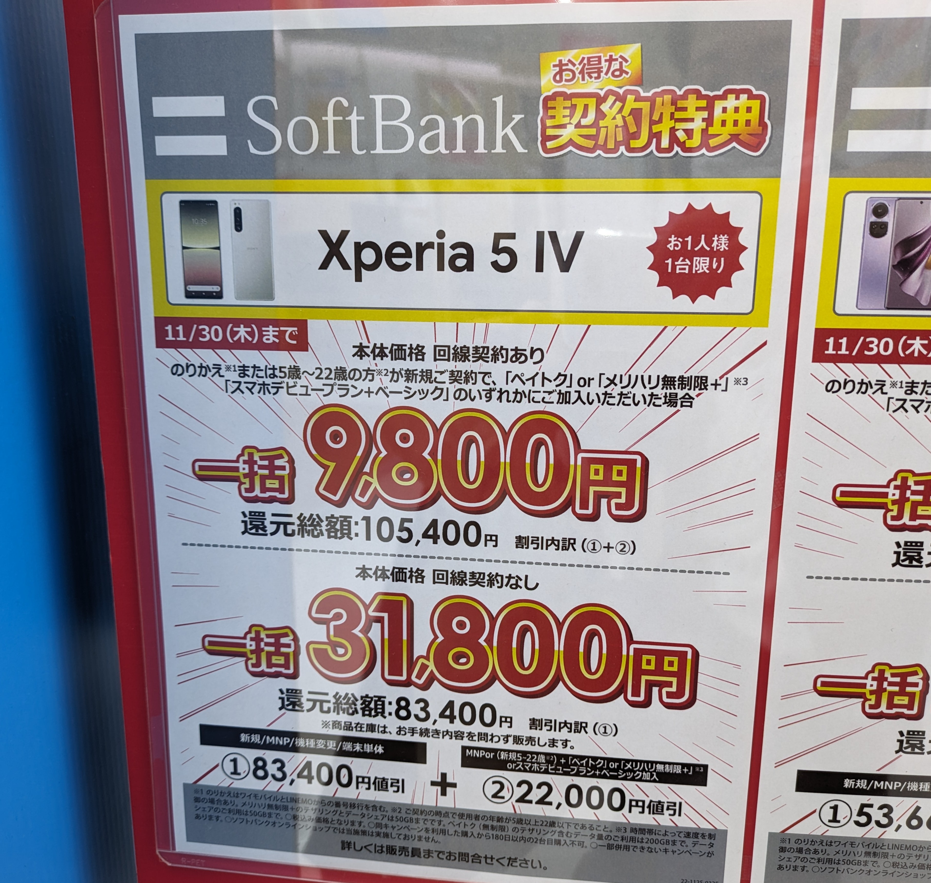 ビックカメラなんば店では、2022年10月発売のソフトバンク「Xperia 5 IV(税込115,200円)」が、MNP若しくは22歳以下新規で一括9,800円(税込)となっています。